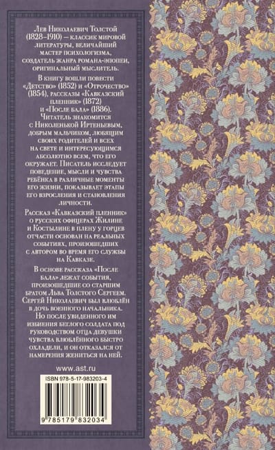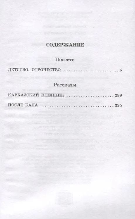 The book includes the stories Childhood (1852) and Boyhood (1854), the short stories Prisoner of the Caucasus (1872) and After the Ball (1886).