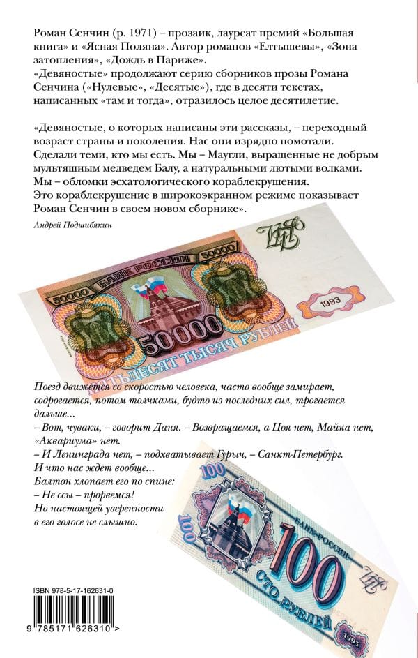 "The Nineties, about which these stories are written, is a transitional age of a country and a generation. Our voices and bones were breaking. We woke up in one country, fell asleep in another, and woke up the next morning in yet a third. They've worn us down. Made us what we are. We are Mowgli, raised not by a kind cartoon bear Baloo, but by natural fierce wolves. We are the wreckage of an eschatological shipwreck. Roman Senchin shows this shipwreck in widescreen mode in his new collection". Andrei Podshibyakin