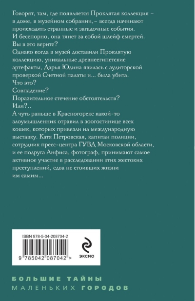 They say that wherever the Cursed Collection appears—in a house, in a museum collection—strange and mysterious events always begin to occur. And, undoubtedly, it leaves a trail of deaths in its wake. Do you believe it? However, when the Cursed Collection, unique ancient Egyptian artifacts, was delivered to the museum, Daria Yudina arrived for an audit by the Accounts Chamber and... was killed. What is this? A coincidence? A stunning coincidence? Or...? And a little earlier, in Krasnogorsk, some criminal poisoned all the cats at a pet hotel that had been brought to an international exhibition.