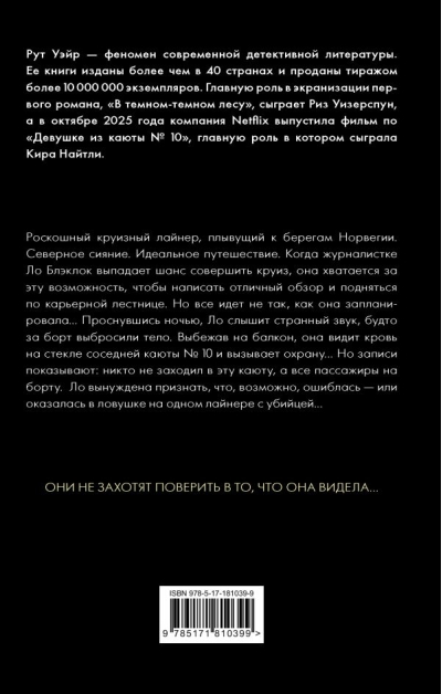 "The Girl in Cabin 10" gracefully balances classic detective fiction and psychological thriller, combining a mysterious atmosphere with a tense pace. The protagonist, journalist Lo Blacklock, is given the chance to travel on a luxury cruise liner bound for Norway. It seems like a wonderful opportunity to have a great time and advance her career by writing an original review. But on her very first night, Lo awakens to strange sounds in the next cabin, then hears a splash—as if a body had been thrown overboard. Running out onto the balcony, the girl sees blood on the glass of cabin #10. However, the guards find nothing, and Lo is forced to take on the case herself, which is much more dangerous than it seems at first glance.