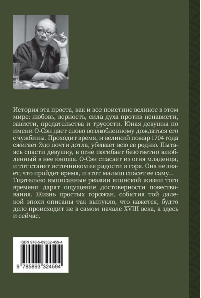This story is simple, like all truly great things in this world: love, loyalty, and fortitude against hatred, envy, betrayal, and cowardice. A young girl named O-Sen promises her lover to wait for him to return from a foreign land. Time passes, and the Great Fire of 1704 burns Edo almost to the ground, killing her entire family. Trying to save the girl, a young man with unrequited love perishes in the fire. O-Sen rescues a baby from the fire, and he will become the source of both her joy and sorrow. She doesn't know that time will pass, and this baby will save her...