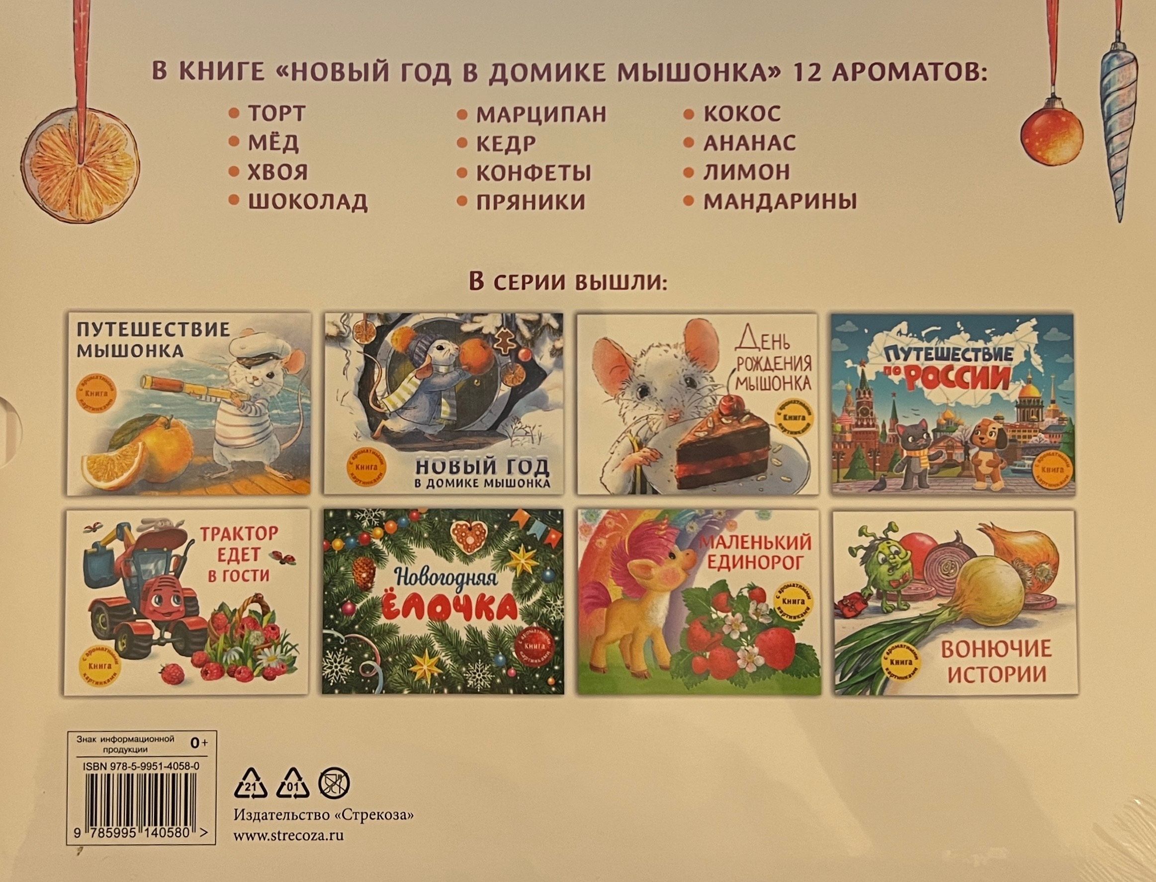 Mouse and his friends are getting ready to celebrate the New Year. What a pity that Father Frost won't be able to come to them! Will the animals be left without presents? Read the story, look at the pictures and together with the mouse enjoy the aromas of cake, honey, pine, chocolate, marzipan, cedar, candy, gingerbread, coconut, pineapple, lemon and tangerine. You just have to rub your finger over the largest pictures to get it. This is a flavorful book for preschool age children. Delight yourself and your child with a scent book.