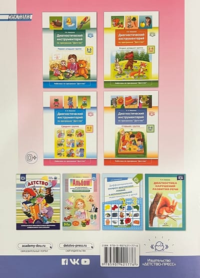 The Diagnostic Toolkit is a collection of theoretical, visual and practical materials that will be useful for teachers in assessing the developmental criteria of older preschool children in various educational areas. "Toolkit" is made in the form of a workbook with beautiful colorful drawings, interesting and understandable to children of this age.