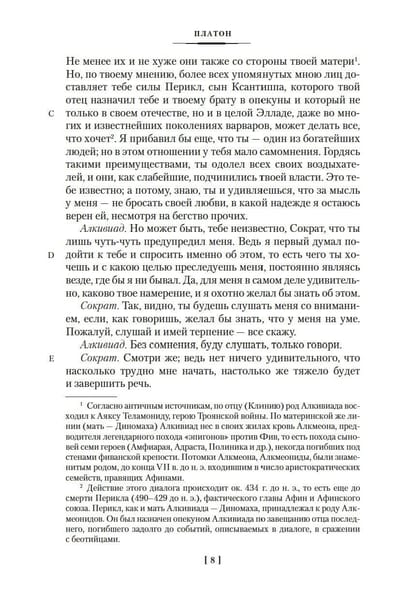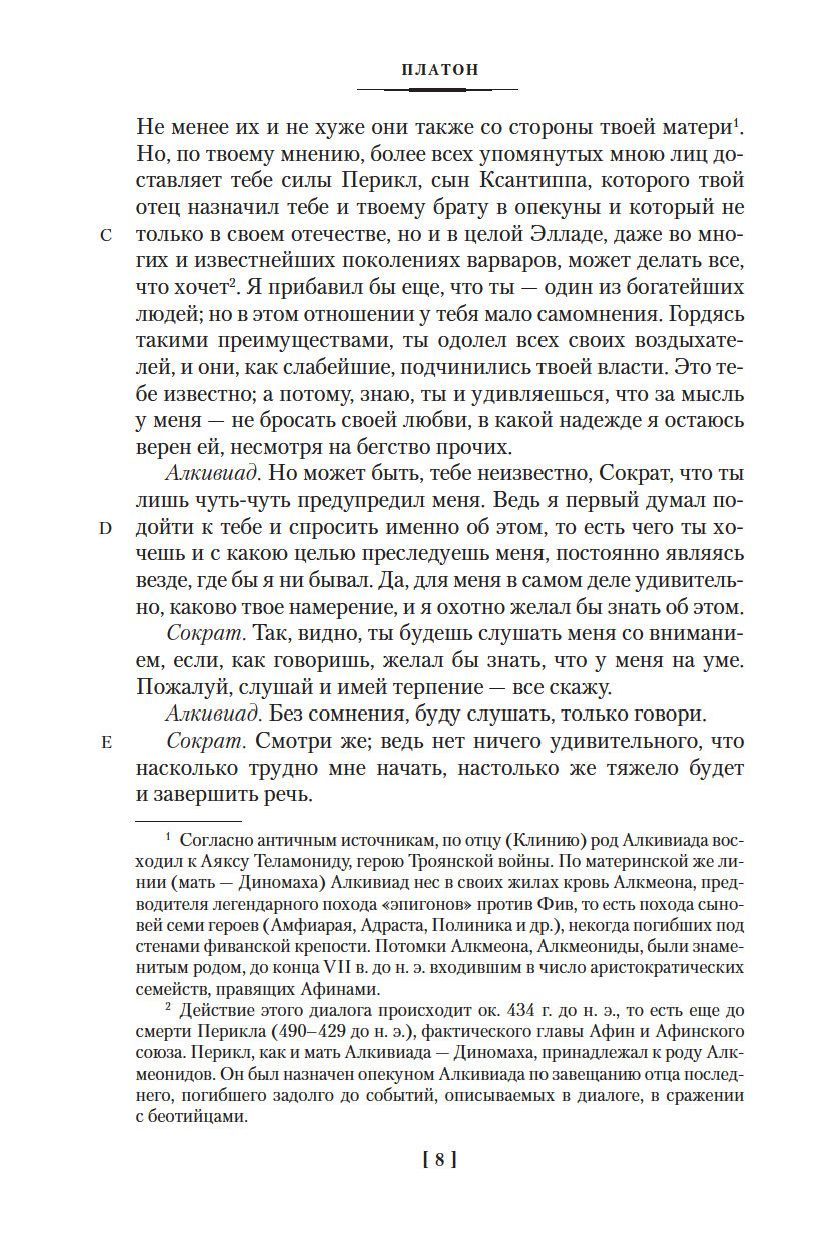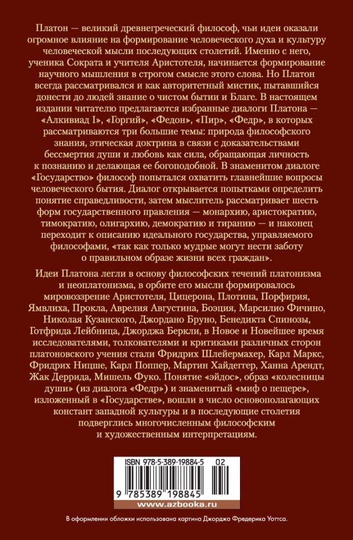 Plato is a great ancient Greek philosopher whose ideas had a great influence on the formation of the human spirit and the culture of human thought of the following centuries. It is with him, a student of Socrates and teacher of Aristotle, that the formation of scientific thinking in the strict sense of the word begins. But Plato has always been regarded as an authoritative mystic who tried to convey to people the knowledge of pure being and the Good. This edition offers the reader selected dialogues of Plato - "Alkiviad I", "Gorgias", "Phaedon", "Pyrus", "Phaedrus", in which three major themes are considered: the nature of philosophical knowledge, ethical doctrine in connection with the evidence of the immortality of the soul and love as a force that turns the personality to knowledge and makes it godlike. In the famous dialog "The State" the philosopher tried to cover the main questions of human existence. The dialog opens with attempts to define the concept of justice, then the thinker considers six forms of state government - monarchy, aristocracy, timocracy, oligarchy, democracy and tyranny - and finally proceeds to the description of an ideal state ruled by philosophers, "since only the wise can bear the care for the right way of life of all citizens".