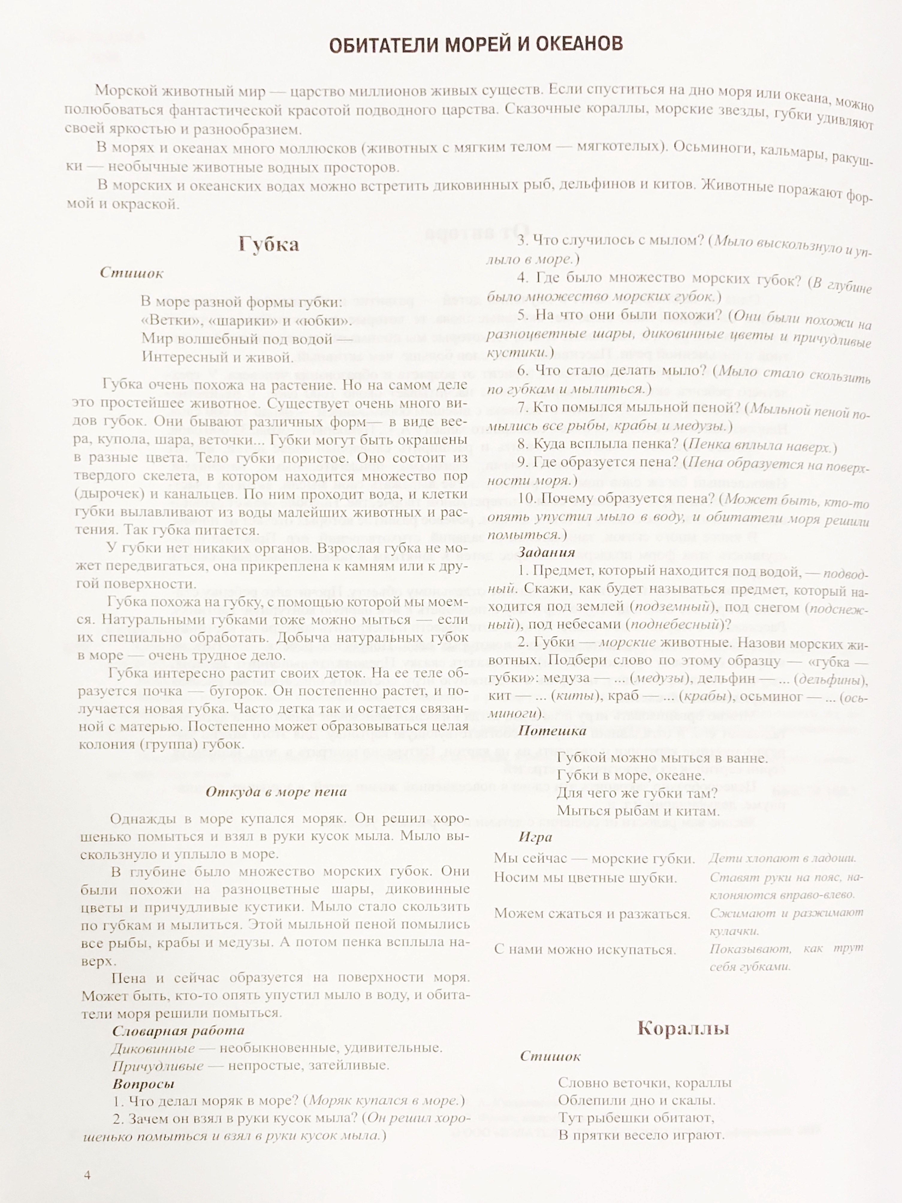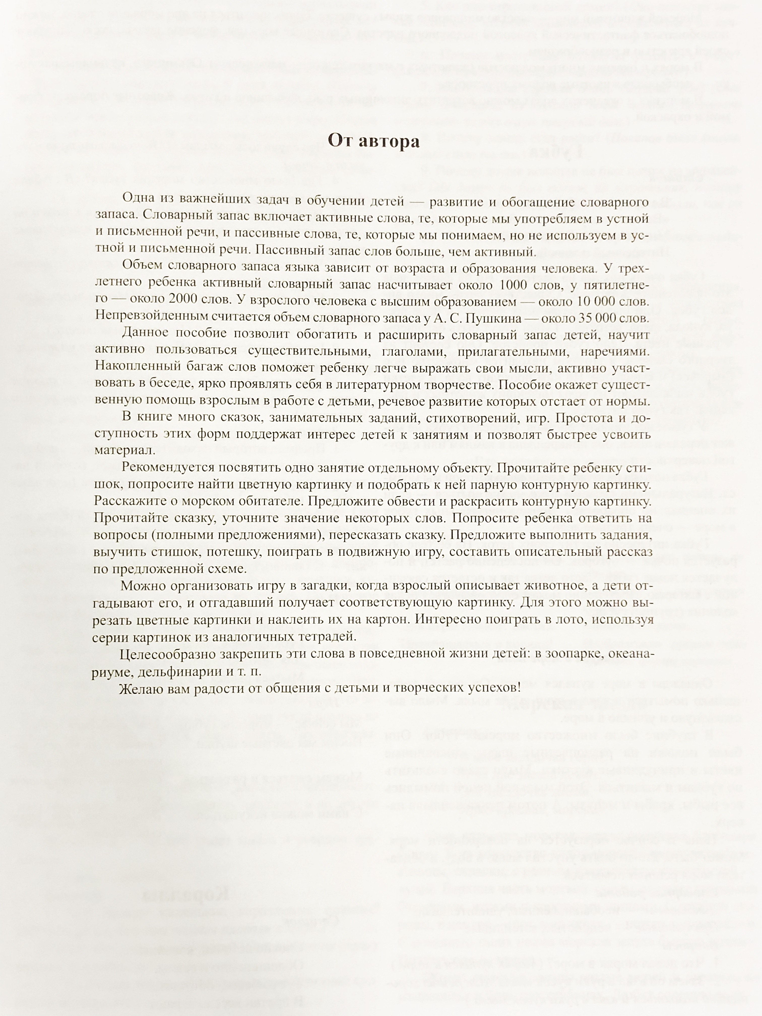 The book contains many author's tales, poems, entertaining tasks, games on the lexical topic "Inhabitants of the seas and oceans". On the sticker is given color subject pictures, as well as pictures for coloring (stroke, shading). The manual will be of great help to educators and speech therapists, and can also be useful to teachers and parents in home lessons with children.