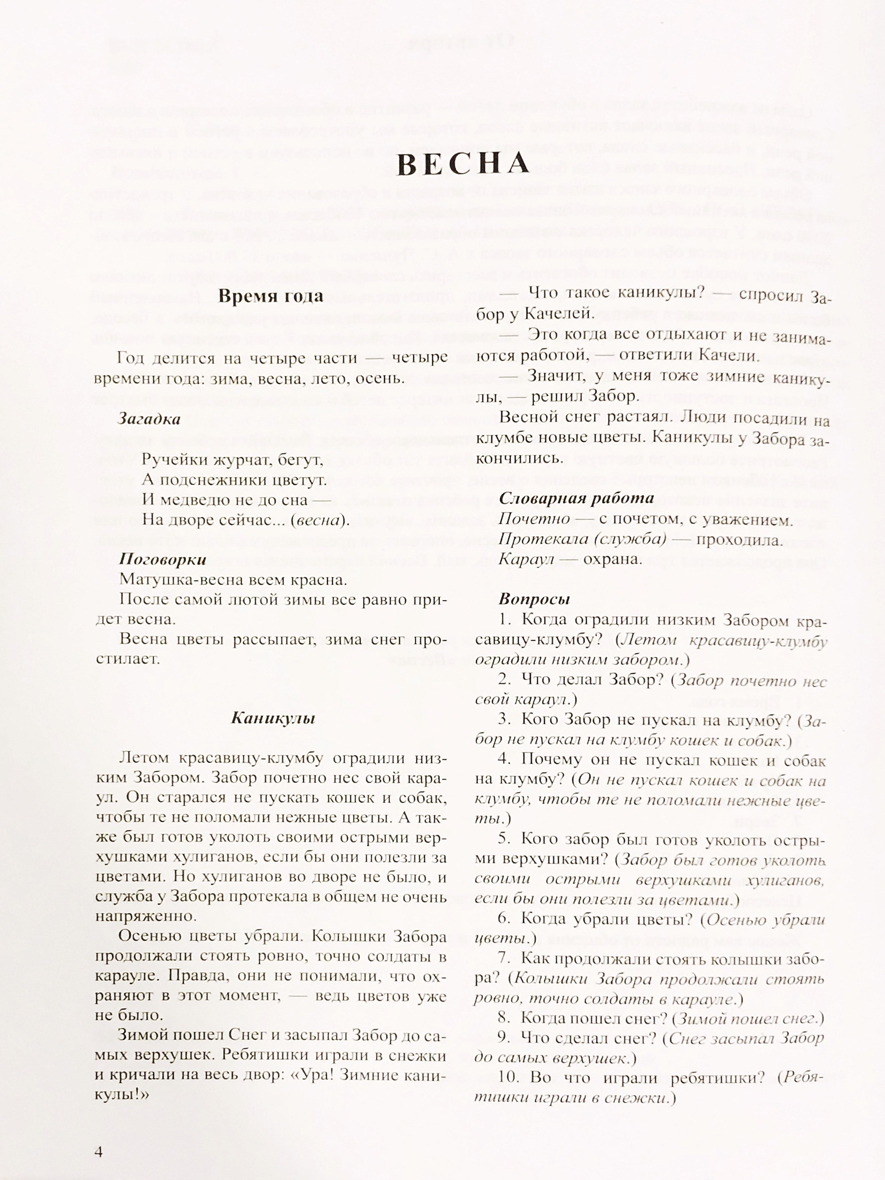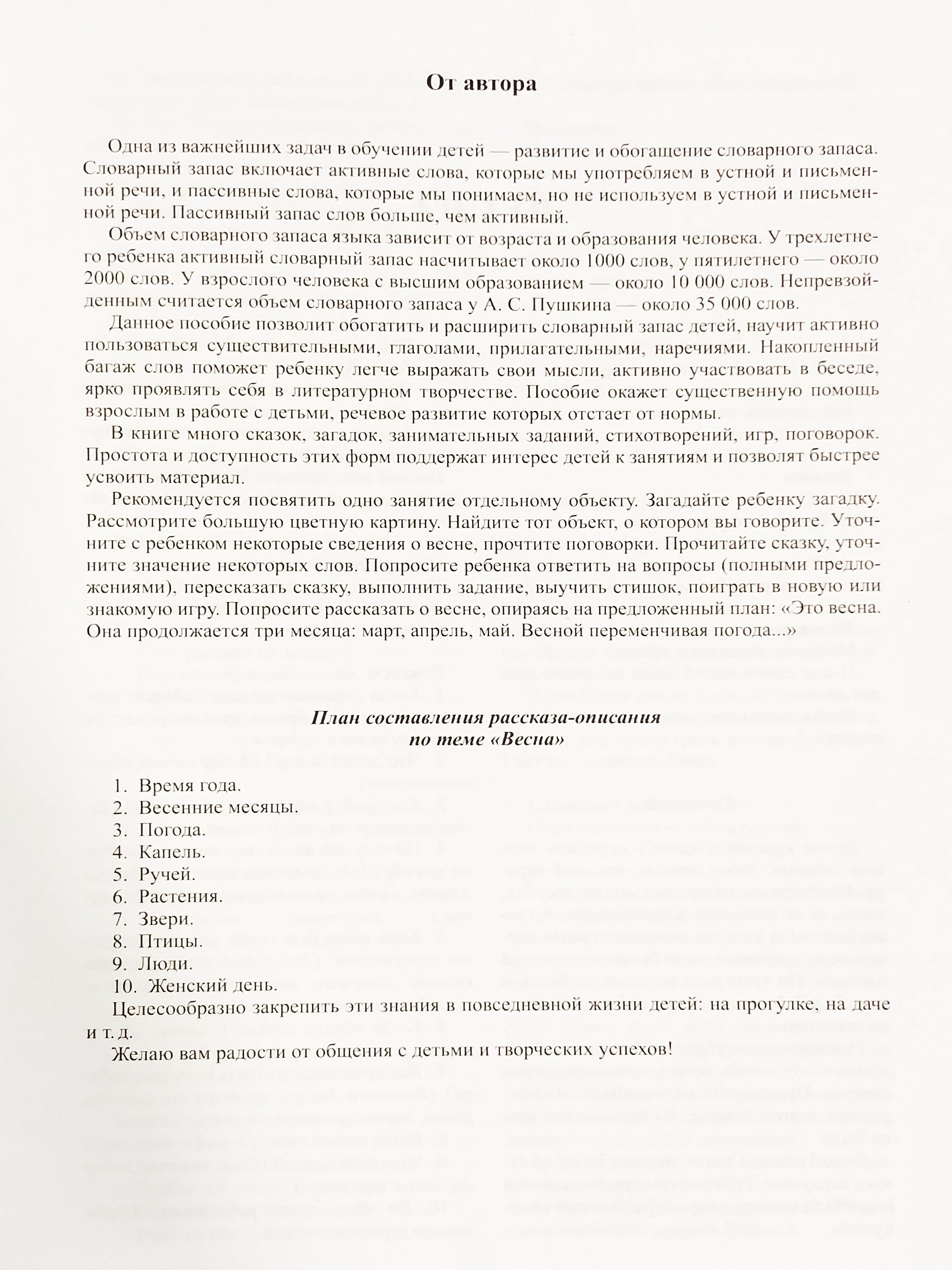 The material presented in the manual will enrich and expand the vocabulary of children 5-7 years old, teach them to use nouns, adjectives, verbs, adverbs. The book contains many author's fairy tales, riddles, sayings, poems, entertaining tasks, games on the lexical topic "Spring". The tab gives color pictures. The manual will be of great help to educators and speech therapists, and can also be useful to tutors and parents in home lessons with children.