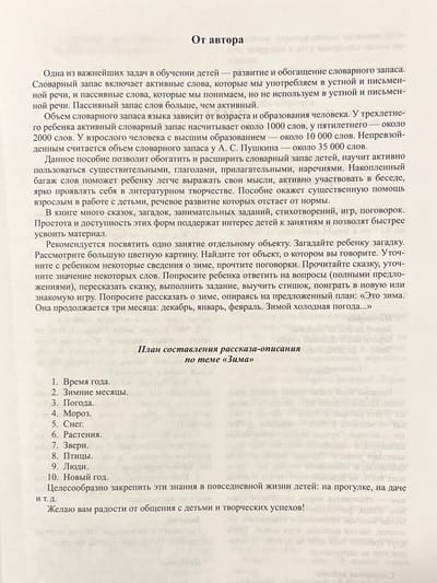The material presented in the manual will enrich and expand the vocabulary of children 5-7 years old, teach them to use nouns, adjectives, verbs, adverbs. The book contains many author's fairy tales, riddles, sayings, poems, entertaining tasks, games on the lexical topic "Winter". The tab gives color pictures.