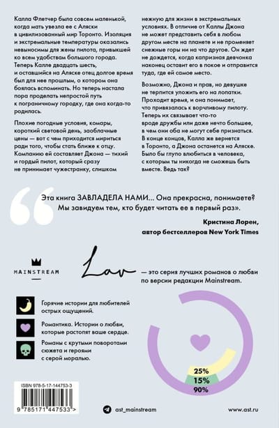 Bad weather, mosquitoes, short daylight hours, exorbitant prices - these are the things Calla has to put up with in order to get closer to her father. Accompanying her is Jonah, a quiet and proud pilot who doesn't immediately accept a stranger who is too gentle to live in extreme conditions. Unlike Calla, Jonah can't imagine himself anywhere else on the planet and wouldn't trade the snowy mountains for anything else. He can't wait for the cranky girl to finally leave him alone and go where she belongs. Jonah may be right, but Calla can't wait to take him down. As time passes, she realizes she's grown attached to the grumpy pilot. Now they're bonded by something like friendship or even something more, something they both can't admit to themselves. After all, Calla is going back to Toronto and Jonah is staying in Alaska. It would be foolish to fall in love with someone you can never be together with. Wouldn't it?