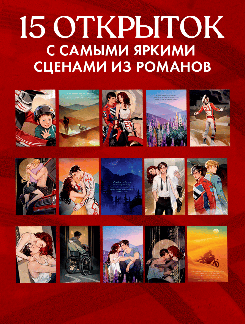 This set of 15 postcards features the most vivid and moving scenes from the Burnout duology, presented in a beautiful gift box. The story of Jacqueline and Remy Bélanger's relationship, along with key moments in their lives, comes to life in the artwork by popular artist AceDia, created specifically for the novels. The open back of the postcards is perfect for writing warm wishes to those you love most. Each postcard is made of sturdy cardboard, and the set is packaged in a convenient and stylish case.