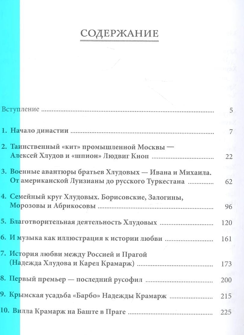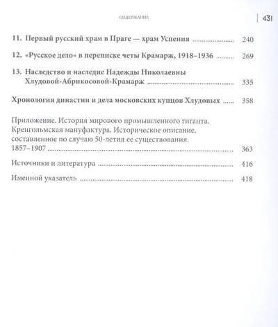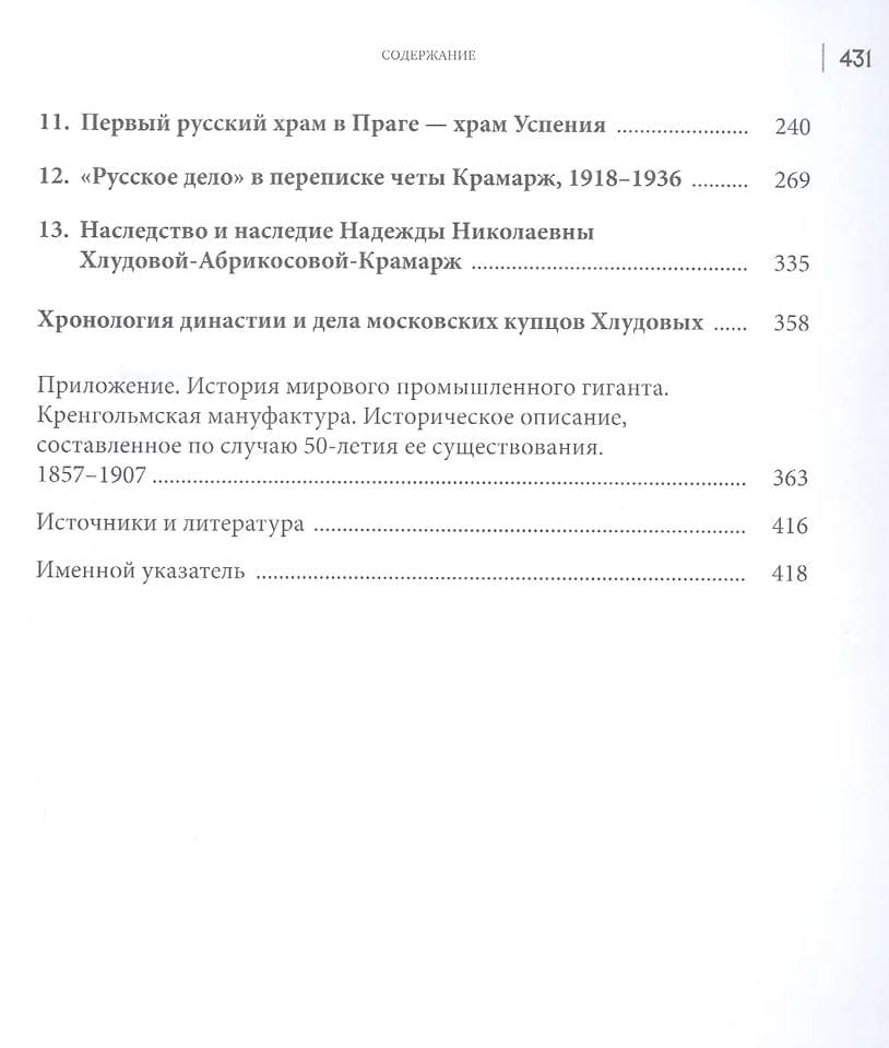 The book pays special attention to the most prominent representative of the Khludov dynasty, Nadezhda Nikolaevna (Abrikosova in her first marriage, Kramář in her second), the wife of the Czech political figure, the first prime minister of independent Czechoslovakia, K. P. Kramář.