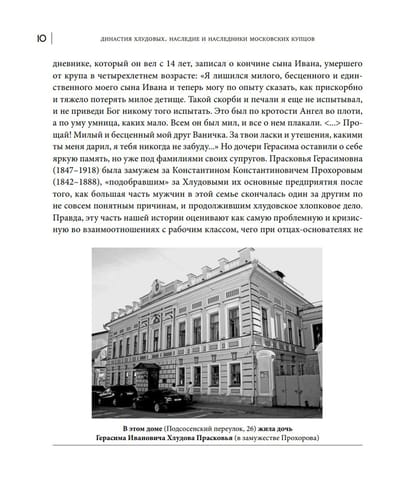 This book by Dmitry Petrovich Abrikosov, a member of a renowned dynasty of Moscow confectioners and philanthropists, is dedicated to the Khludov merchant family, to which the author is closely connected. The history of the Khludov family of textile manufacturers and their descendants is closely linked to Moscow. Both the entrepreneurial activities and family life of this dynasty are rooted in the traditions of Moscow merchants.