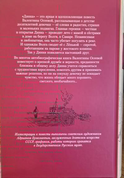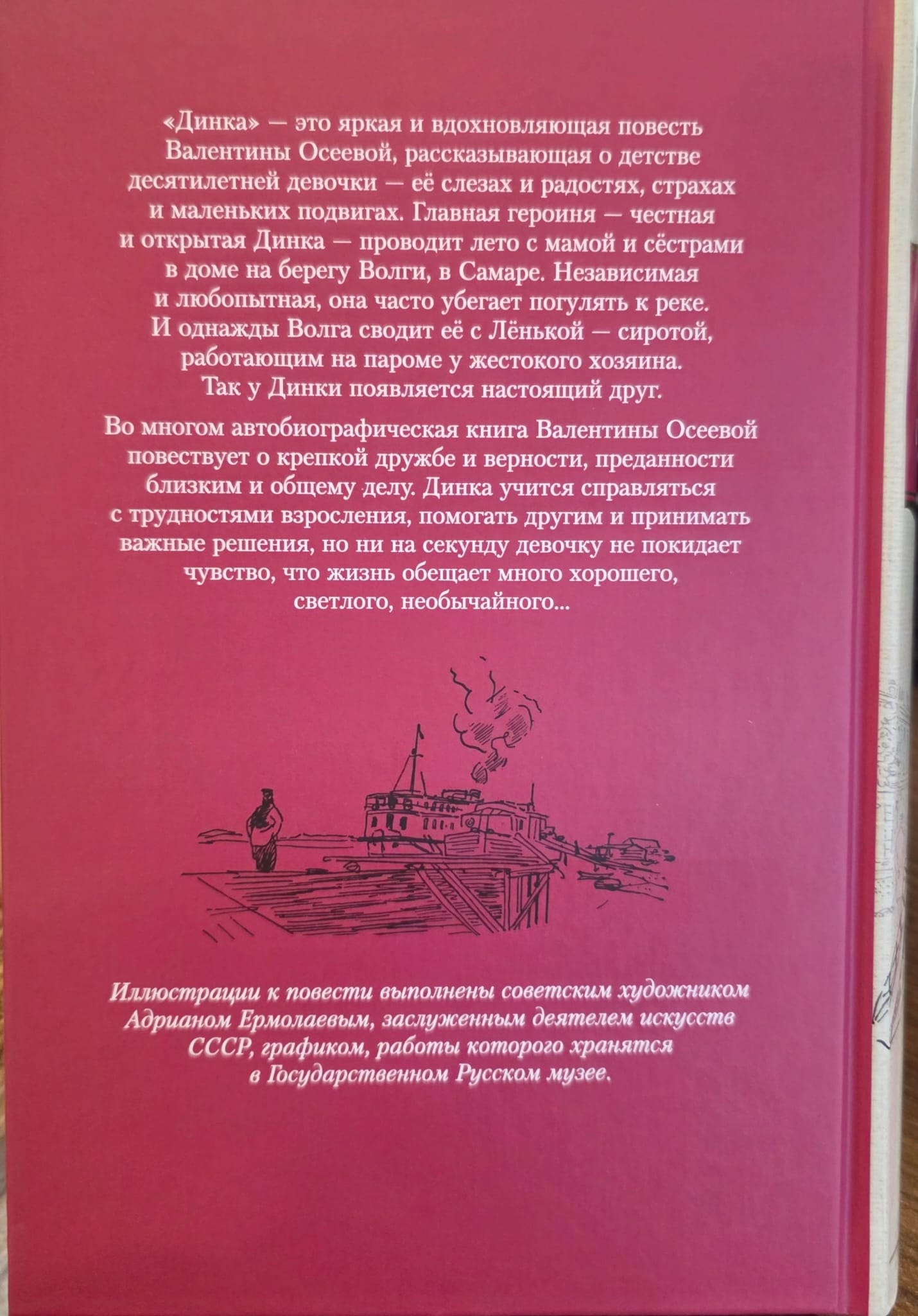 "Dinka" is a vibrant and inspiring story by Valentina Oseeva, telling the story of a ten-year-old girl's childhood—her tears and joys, fears and small heroic deeds. The protagonist, the honest and open Dinka, spends the summer with her mother and sisters in a house on the banks of the Volga in Samara. Independent and curious, she often runs away for walks by the river. And one day, the Volga brings her together with Lyonka, an orphan working on a ferry for a cruel owner. Thus, Dinka gains a true friend.