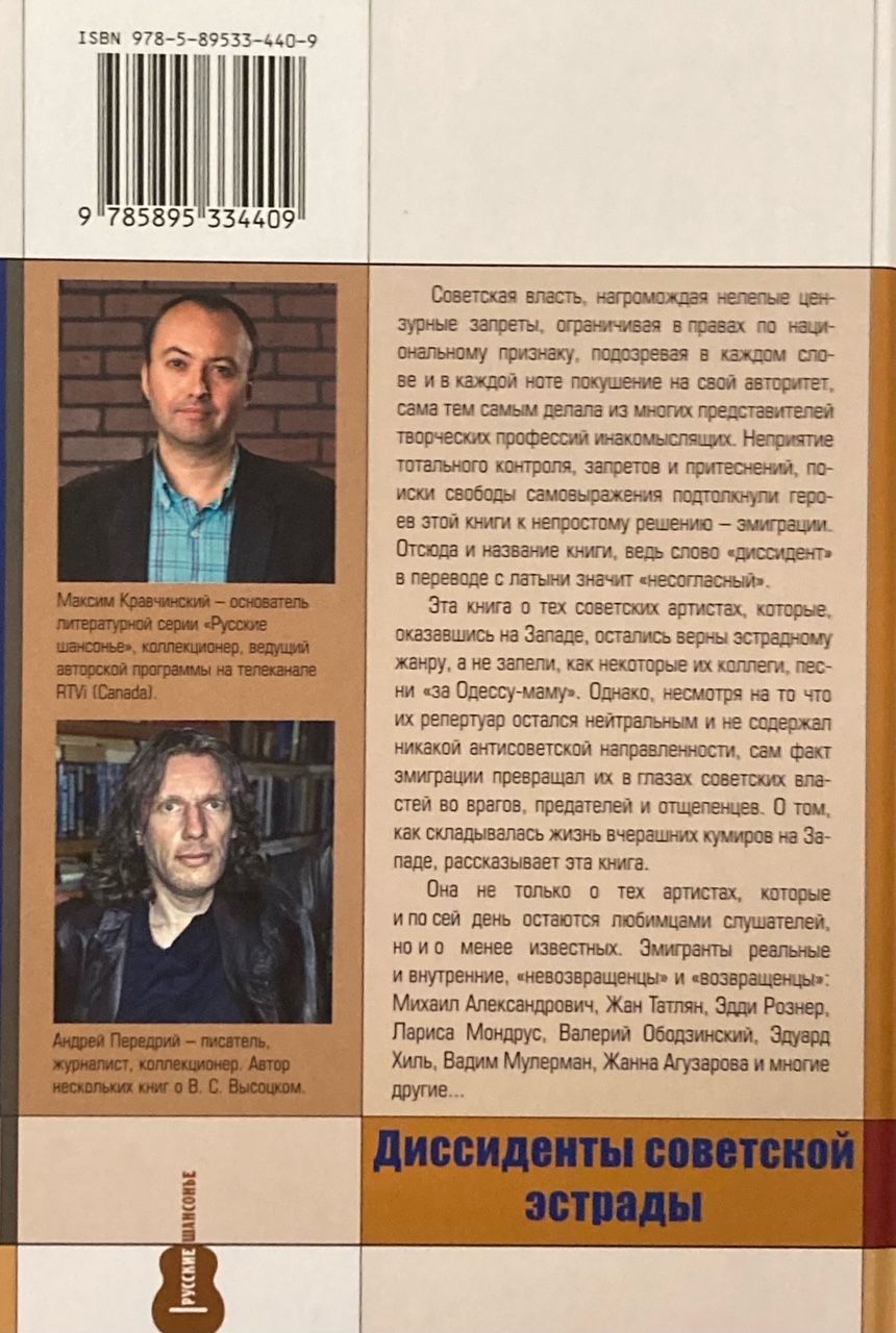 The Soviet government, piling up absurd censorship bans, limiting rights based on nationality, suspecting every word and every note as an attack on its authority, thereby turned many representatives of creative professions into dissenters. The rejection of total control, bans and oppression, the search for freedom of expression pushed the heroes of this book to a difficult decision - emigration. Hence the title of the book, because the word "dissident" in Latin means "dissenter". This book is about those Soviet artists who, having found themselves in the West, remained faithful to the pop genre, and did not, like some of their colleagues, sing songs "for Odessa-mama". However, despite the fact that their repertoire remained neutral and did not contain any anti-Soviet direction, the very fact of emigration turned them into enemies, traitors and renegades in the eyes of the Soviet authorities. This book tells about how the lives of yesterday's idols in the West developed.