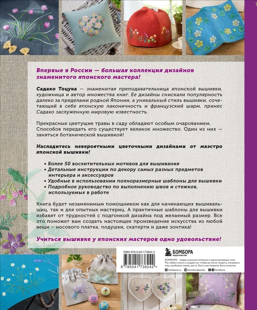 For the first time in Russia - a unique collection of embroidery motifs from the famous Sadako Totsuki! Her designs have gained popularity far beyond her native Japan, and a unique style of embroidery, combining Japanese laconism and French charm, brought Sadako deserved world fame. And finally the book by the maestro of botanical embroidery has reached Russia! According to the beliefs of the Japanese, every local resident must occasionally look at the flowers and admire them, coming to delight and enjoy the natural beauty. This ritual even has a special name - "hanami". In Japanese art - be it books, movies, painting or needlework, very often there are stable symbols associated with the natural world. The embroidery designs developed by the famous Japanese embroidery teacher, artist and author of many books, Sadako Totsuka, are closely associated with hanami. Laconic botanical motifs incomparable Sadako so and want to realize.