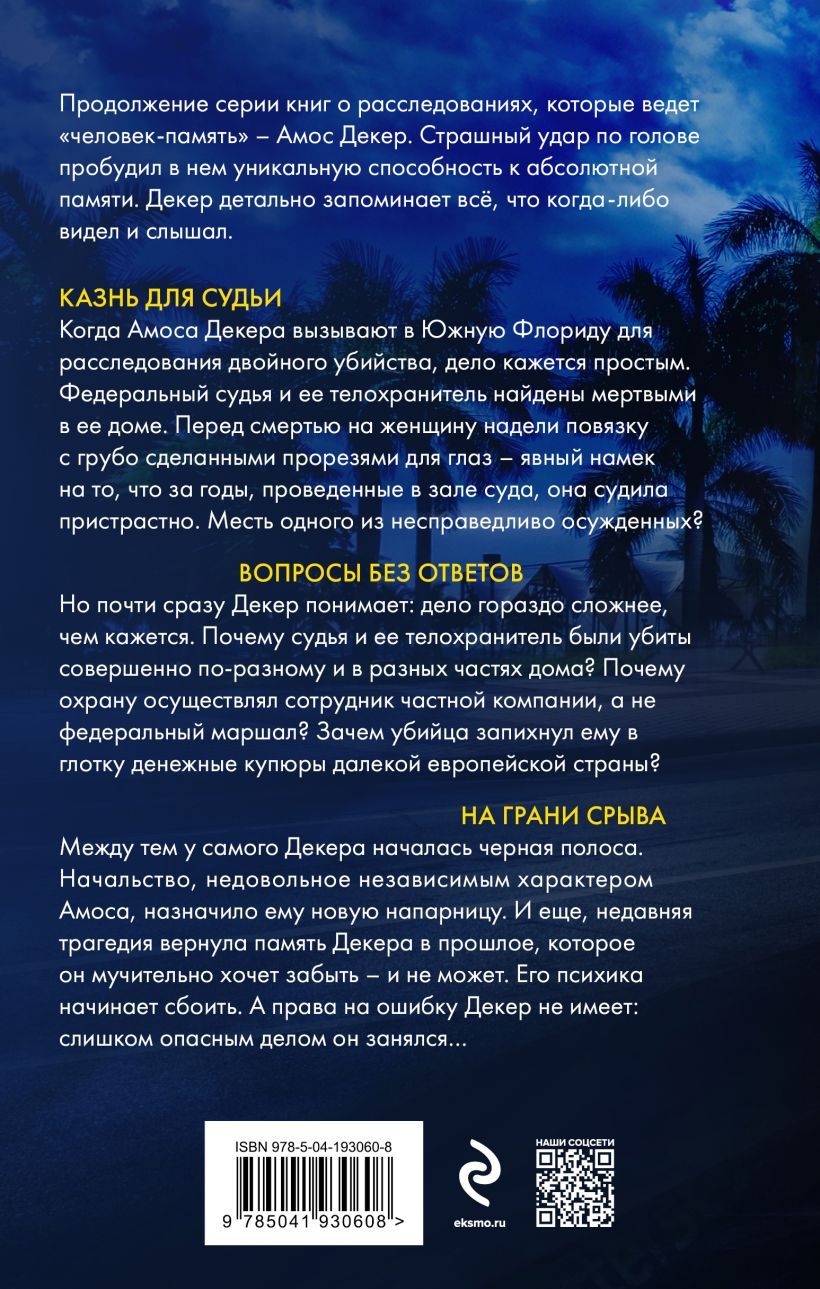 But almost immediately Decker realizes: the case is far more complicated than it seems. Why were the judge and her bodyguard killed in completely different ways and in different parts of the house? Why was the security guard an employee of a private company and not a federal marshal? Why did the killer shove bills of money from a distant European country down his throat? Meanwhile, Decker himself was going through a rough patch. His superiors, unhappy with Amos's independent nature, assigned him a new partner. And also, a recent tragedy has brought back the memory of Decker in the past, which he painfully wants to forget - and can not. His psyche is starting to malfunction. And Decker has no margin for error: too dangerous a business he's engaged in....