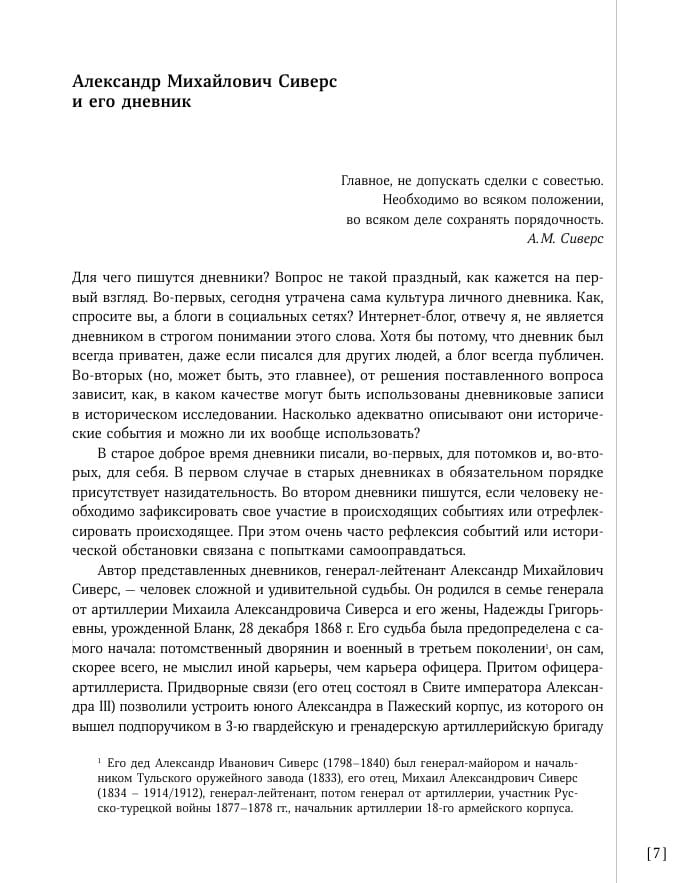 The diaries of Lieutenant General Alexander Mikhailovich Sievers (1868 – after 1932) represent unique historical material. They shed light on many details of the author's biography. Furthermore, they contain Sievers's personal impressions of his interactions with such prominent figures of the White movement as A. I. Denikin, A. S. Lukomsky, and I. P. Romanovsky. Sievers also knew representatives of the Red Army—Generals A. A. Baltiysky, P. P. Lebedev, N. N. Stogov, and others.
