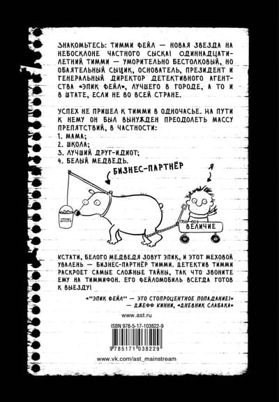 Meet Timmy Feil, the new star in the private investigator firmament! Eleven-year-old Timmy is a hilariously goofy but charming detective, founder, president, and CEO of Epic Fail, the best detective agency in the city, if not the state, if not the country. Success didn't come to Timmy overnight. On the way to it he had to overcome a lot of obstacles, in particular: 1. mom; 2. school; 3. best idiot friend; 4. polar bear. By the way, the polar bear's name is Epic, and this furry laggard is Timmy's business partner. Detective Timmy will solve the toughest mysteries, so call him on Timmiphone. His Failomobile is always ready to go!
