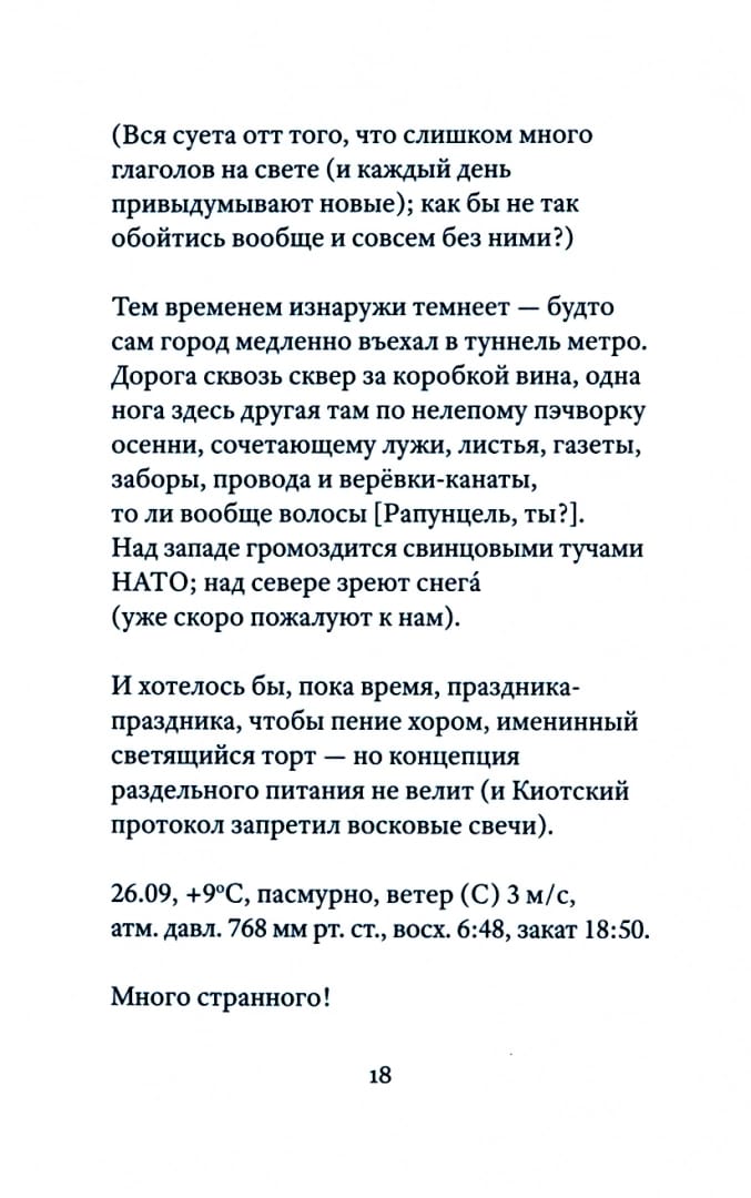In Alexei Konakov's semi-abstract prose, phenological observations, meteorological forecasts, housekeeping issues, and the concerns of family life are organized around one distinctly paranoid idea.