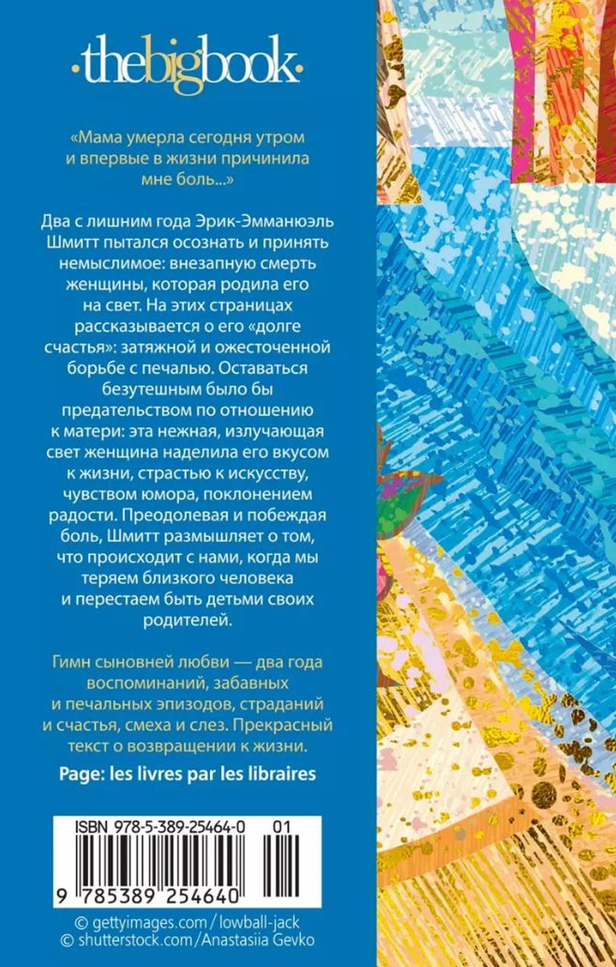 "My mother died this morning and for the first time in my life she hurt me..." For more than two years, Eric-Emmanuel Schmitt tried to realize and accept the unthinkable: the sudden death of the woman who had brought him into the world. These pages tell of his "duty of happiness": a protracted and bitter struggle with grief. To remain inconsolable would be a betrayal to his mother: this gentle, radiant woman endowed him with a taste for life, a passion for art, a sense of humor and, almost more importantly, a worship of joy.