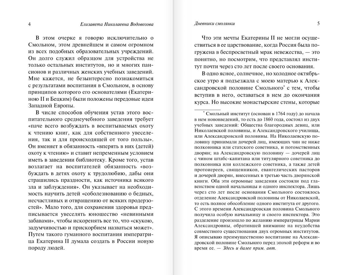 In her memoir essay, Elizaveta Vodovozova describes the institute's customs without embellishment: the strictness of the class ladies, the traditional game of adoration, meager food and superficial study of subjects. She describes the educational reform of K. D. Ushinsky, which awakened in the young Smolensk girl an interest in acquiring new knowledge and completely turned upside down the idea of what education is.