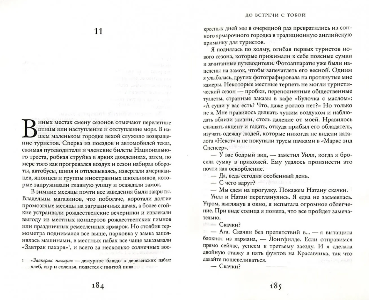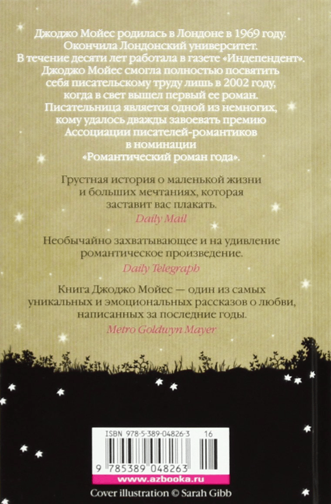 Lou Clark knows how many steps there are from the bus stop to her house. She knows that she really likes her job at the cafe and that she probably doesn't love her boyfriend Patrick. But Lou doesn't know that she's about to lose her job and that in the near future, she'll need all the strength she can muster to overcome the problems that have befallen her.