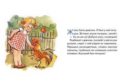 Once upon a time there lived a girl, and she had a cockerel. The girl was a good housewife, but one day she swapped the cockerel for a hen. The girl loved the hen too, fed and stroked it – until she saw a duck. She swapped the duck for a puppy too. But the puppy didn’t want to be friends with the girl, who herself didn’t know how to be friends. And he ran away.