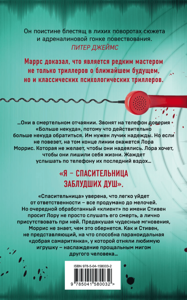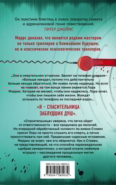 ...They are deathly desperate. They call the Nowhere Else Helpline because there really is nowhere else to turn. They need a ray of hope. But if they're unlucky, it's Laura Morris on the other end of the line. Who doesn't want them to hope. Laura wants them to take their own lives. She wants to hear them breathe their last breath over the phone...