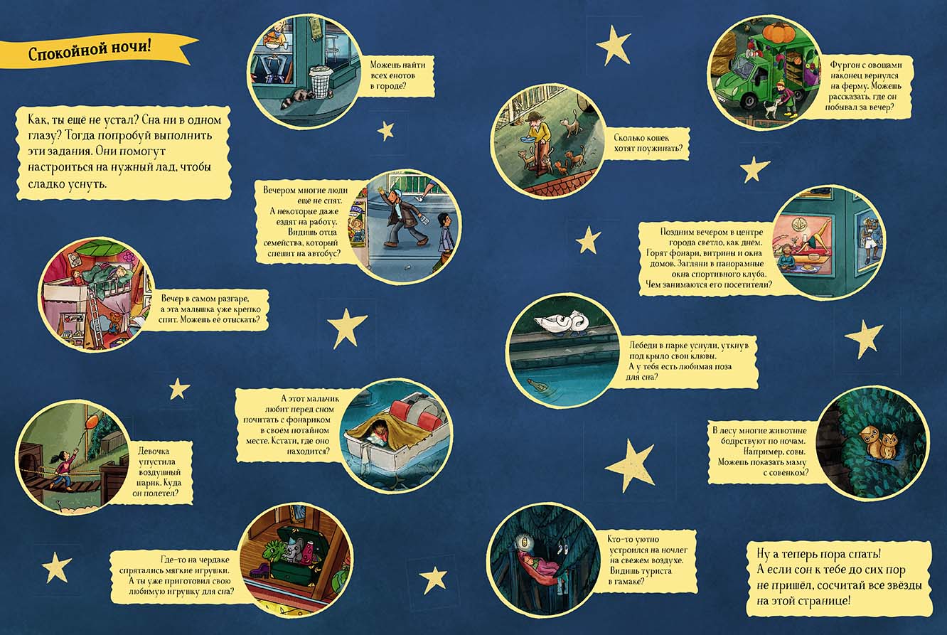 The final spread of the Wimmelbook is dedicated to tasks. These will help them discover even more details and plot lines, while setting the right mood for a sweet sleep.