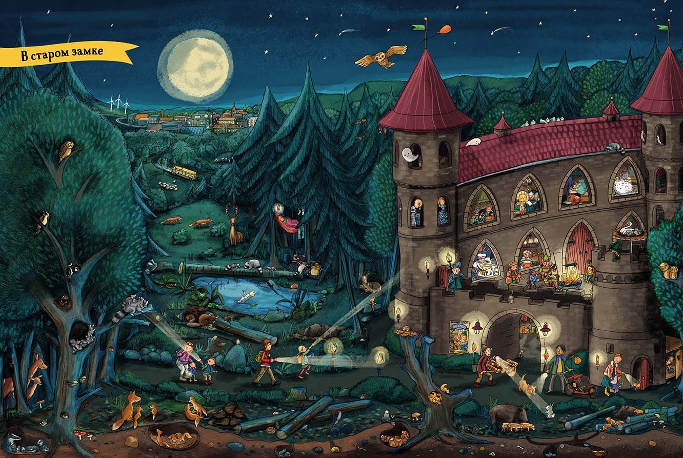 These and many other stories await attentive readers of the evening Wimmelbook. They will join the book's characters as they stroll through the illuminated city streets, dance to music in the park, visit a farm, and visit an ancient castle during the "Night at the Museum" program.