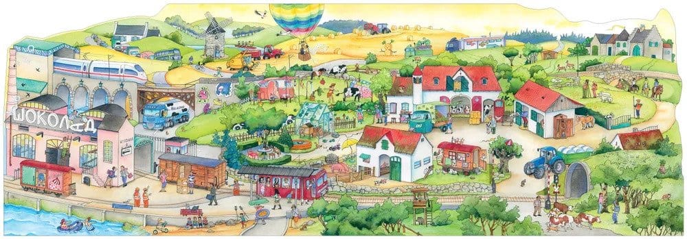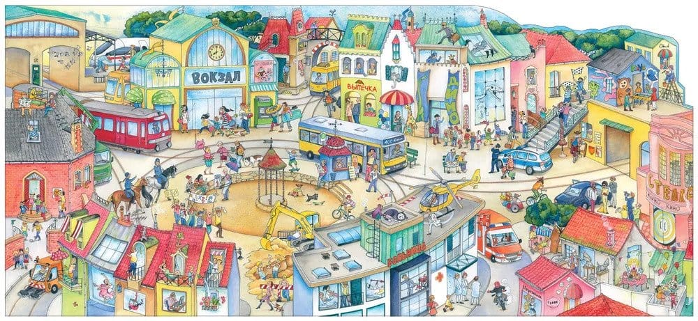 Ready to drive along the seashore and enjoy the mountain views? To walk around cozy towns and meet their inhabitants? The train is already leaving the station! Open the book, look at each panoramic scene and travel with the characters through the pages of this extraordinary wimmelbook! The wonders don't end there: some pages have tunnel windows cut into them, and some have flaps that open up and make the pages so long that the whole train can fit on them!