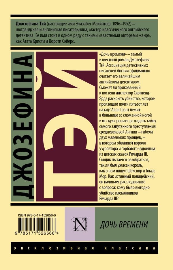 Daughter of Time is Josephine Tey's most famous novel. The Association of Detective Writers of England officially considers it the greatest English detective. Can a bedridden Scotland Yard inspector solve a murder that took place almost five hundred years ago? Alan Grant lies in hospital with a broken leg and out of boredom decides to solve the mystery of the most intricate crime of medieval England - the death of two little princes - which is accused of the usurper king and the hunchbacked monster from children's fairy tales Richard III. The detective tries to figure out if the king was as terrible as Shakespeare and Thomas More write about him. As a true policeman, he begins his investigation with the question: who benefited from the murder of Richard III's nephews?