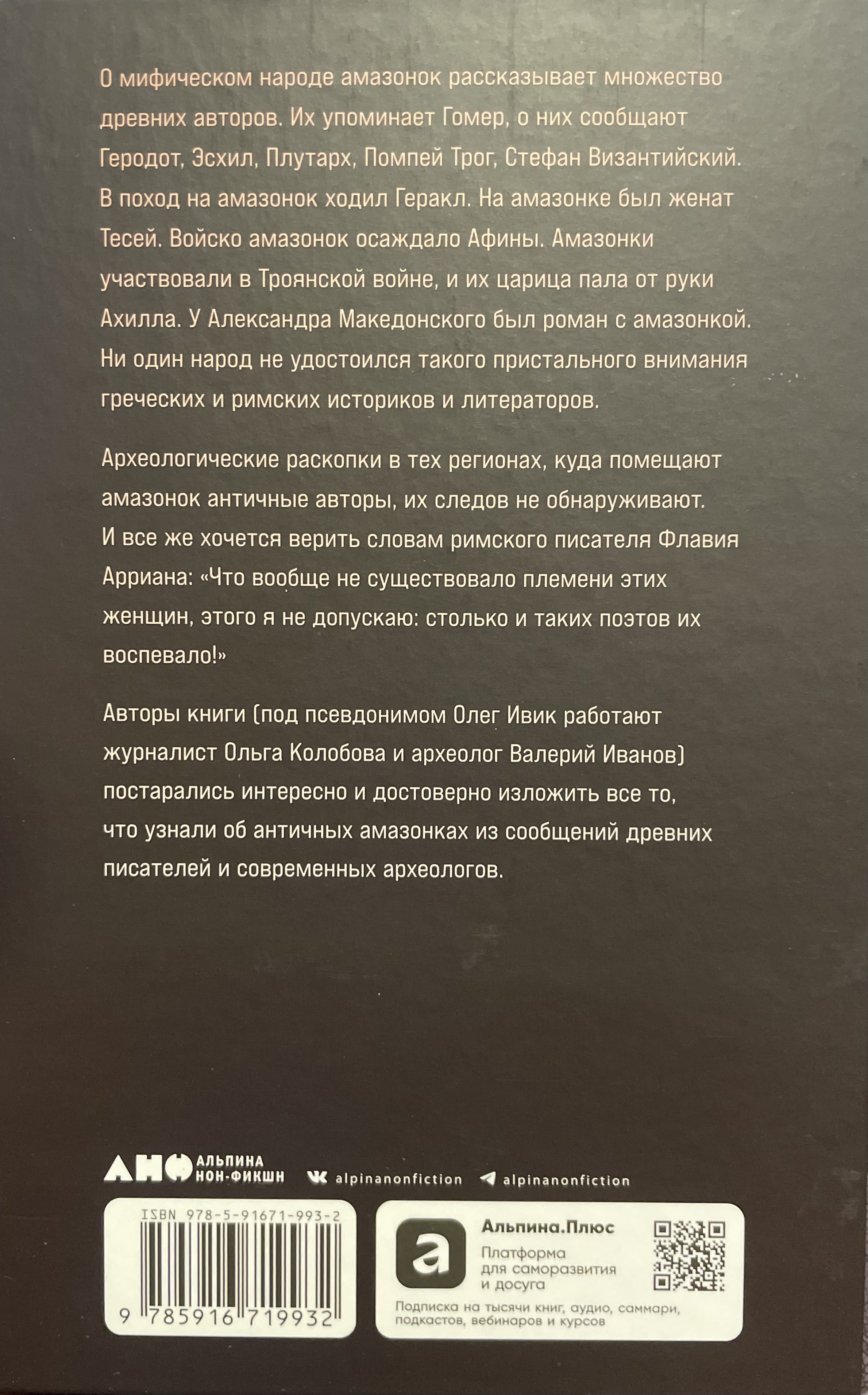 The term "Amazon" is often used to describe any warrior women. But the authors of this book (journalist Olga Kolobova and archaeologist Valery Ivanov, writing under the pseudonym Oleg Ivik) have dedicated their work to real Amazons: women credited by ancient authors with founding their own militarized states within the ecumene. They will also explore the Scythian and Sauromatian warrior women—their histories are too closely intertwined with those of mythological Amazons.