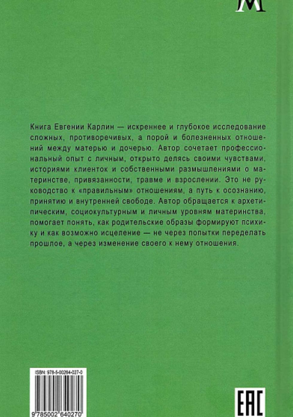 Evgenia Karlin's book is a sincere and profound study of the complex, contradictory, and sometimes painful relationships between mother and daughter. The author combines professional experience with personal, openly sharing her feelings, clients' stories, and her own thoughts on motherhood, attachment, trauma, and growing up. Ego is not a guide to the "right" relationship, but a path to awareness, acceptance, and inner freedom.