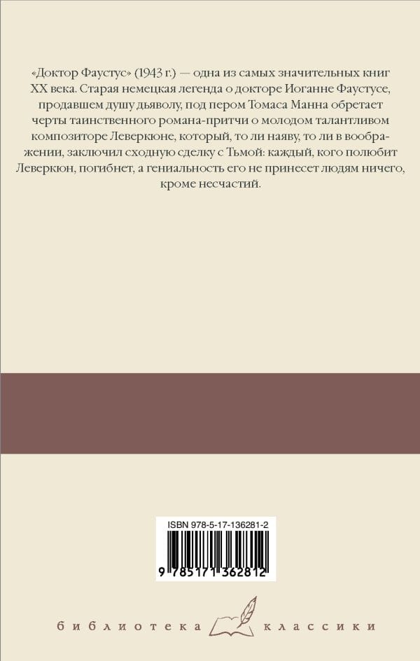 "Dr. Faustus" (1943) - one of the most significant books of the twentieth century. The old German legend of Dr. Johann Faustus, who sold his soul to the devil, under the pen of Thomas Mann acquires the features of a mysterious novel-parable about a young talented composer Leverkühn, who, whether in reality or in imagination, made a similar deal with the Darkness: everyone who loves Leverkühn, will die, and his genius will bring people nothing but misfortune.