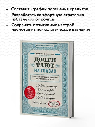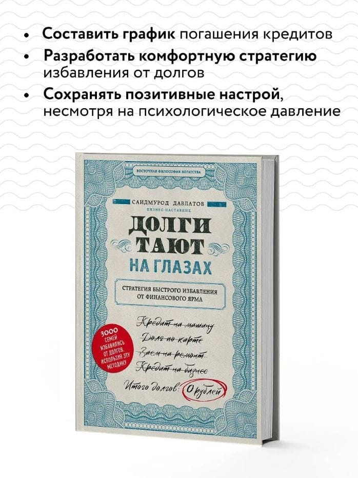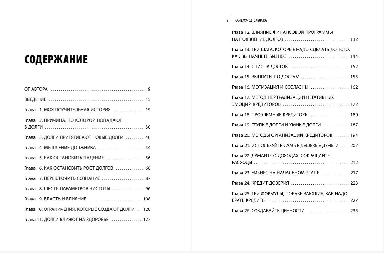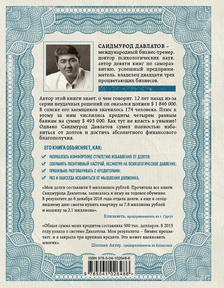 Debt is a shackle that drags you down, prevents you from developing and feeling happy. The author of this book, an international business coach, Doctor of Economics and owner of 23 businesses, offers a well-thought-out strategy for getting rid of the financial yoke. Saidmurod Davlatov knows what he is talking about. 12 years ago, due to a series of bad decisions, he ended up owing $ 1,846,000. There were 174 people on his list of borrowers. Plus, he had loans to four different banks totaling $ 493,000. How can you not become despondent? However, Davlatov managed to completely get rid of debt and achieve financial well-being.