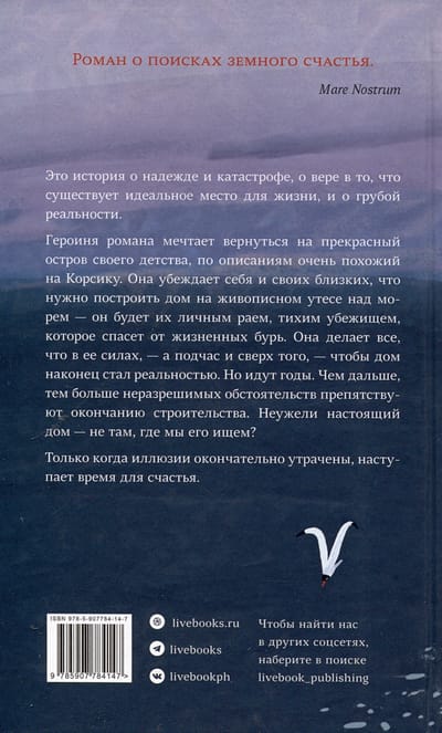 It is a story of hope and disaster, of the belief that there is an ideal place to live and the harsh reality. The heroine of the novel dreams of returning to the beautiful island of her childhood, by descriptions very similar to Corsica. She convinces herself and her family to build a house on a picturesque cliff above the sea - it will be their personal paradise, a quiet refuge that will save them from the storms of life. She does everything in her power, and sometimes even beyond that, to make the house finally become a reality. But the years go by. The further they go, the more intractable circumstances prevent the house from being completed. Is the real home not where we're looking for it? Only when the illusions are finally lost is it time for happiness.