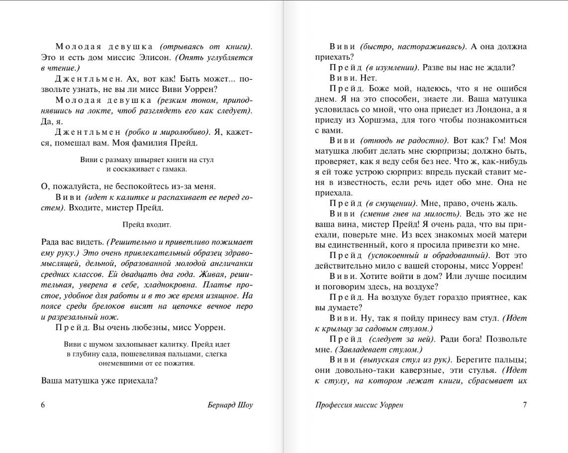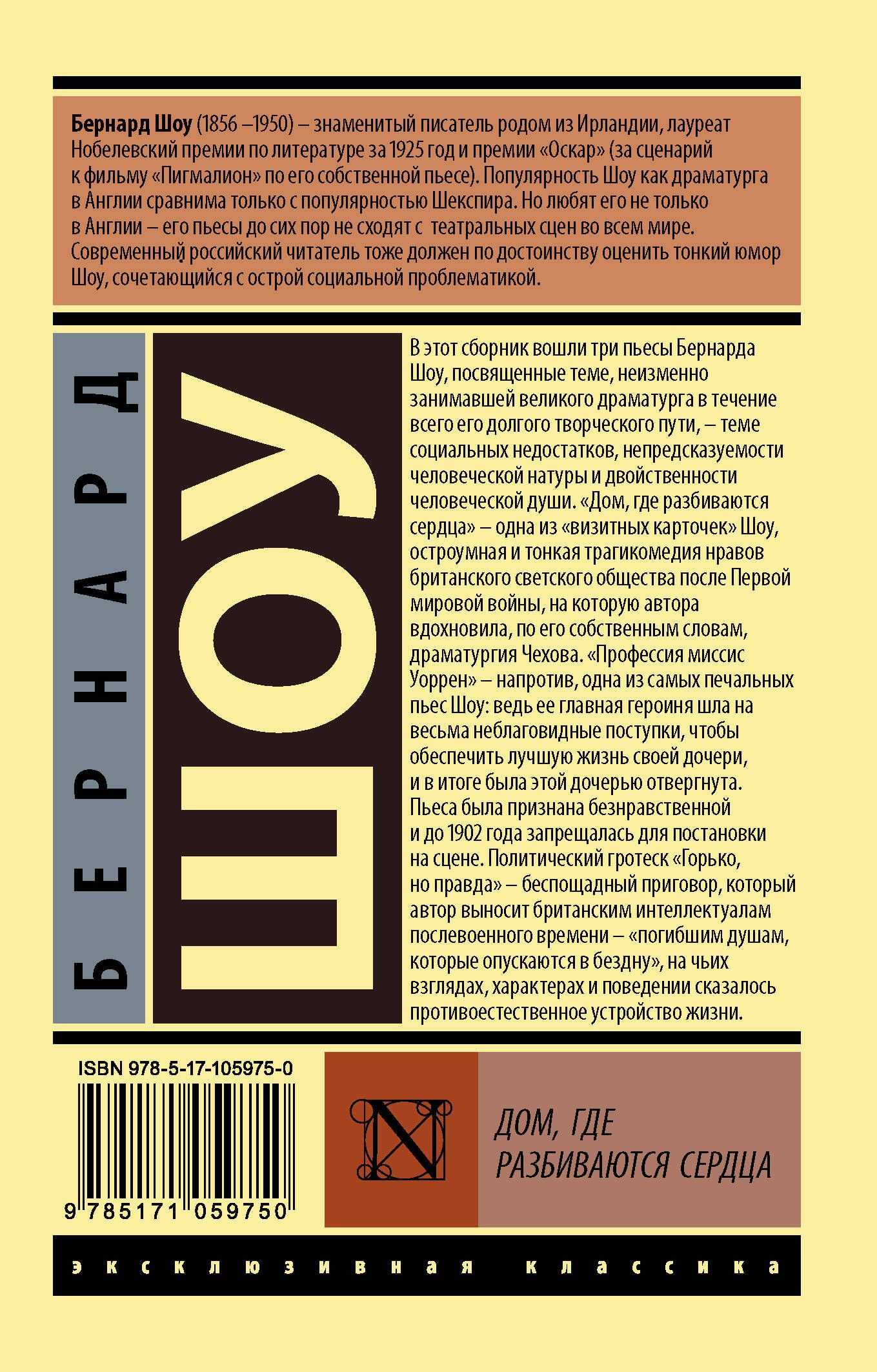 "Mrs. Warren's Profession," on the other hand, is one of Shaw's saddest plays: its title character resorted to extremely unseemly acts to provide a better life for her daughter, and was ultimately rejected by that daughter. The play was deemed immoral and was banned from the stage until 1902. The political grotesque "Bitter but True" is a merciless verdict that the author passes on British intellectuals of the post-war period - "lost souls who are descending into the abyss", whose views, characters and behavior were affected by the unnatural structure of life.