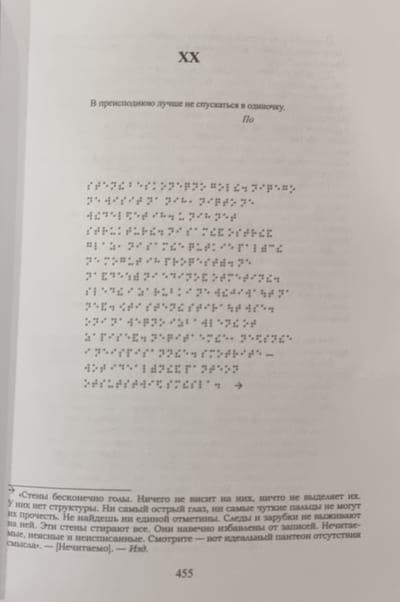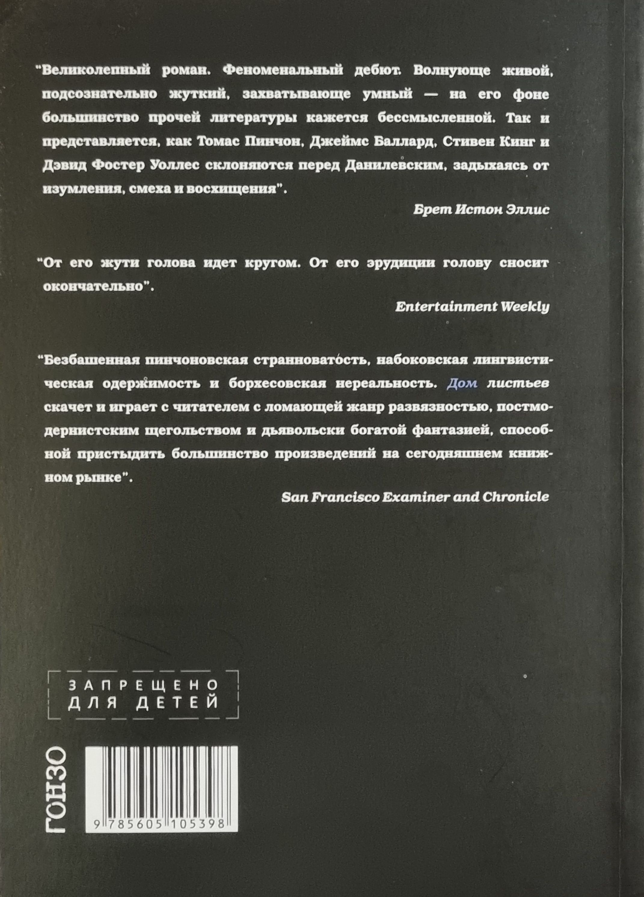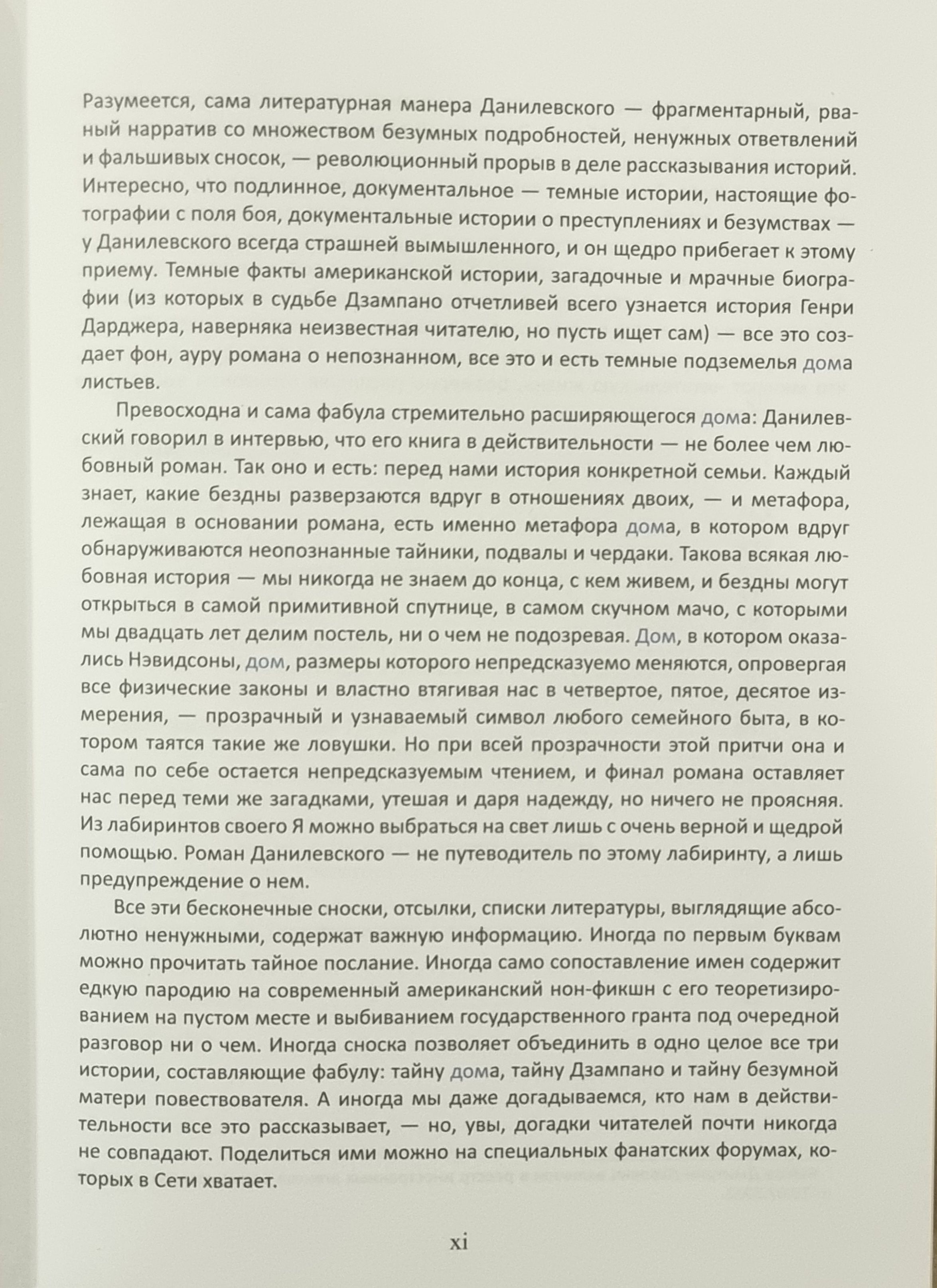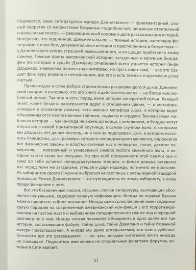 A horror novel about a rapidly expanding house; a story about the power of love; a satire on pseudoscientific speculation; a fundamental study of a film that does not exist, made by a blind old man; notes from the labyrinths of the subconscious; a sentimental wandering through the infernal circles of life - all this in an endless interweaving creates a single plot of "House of Leaves".