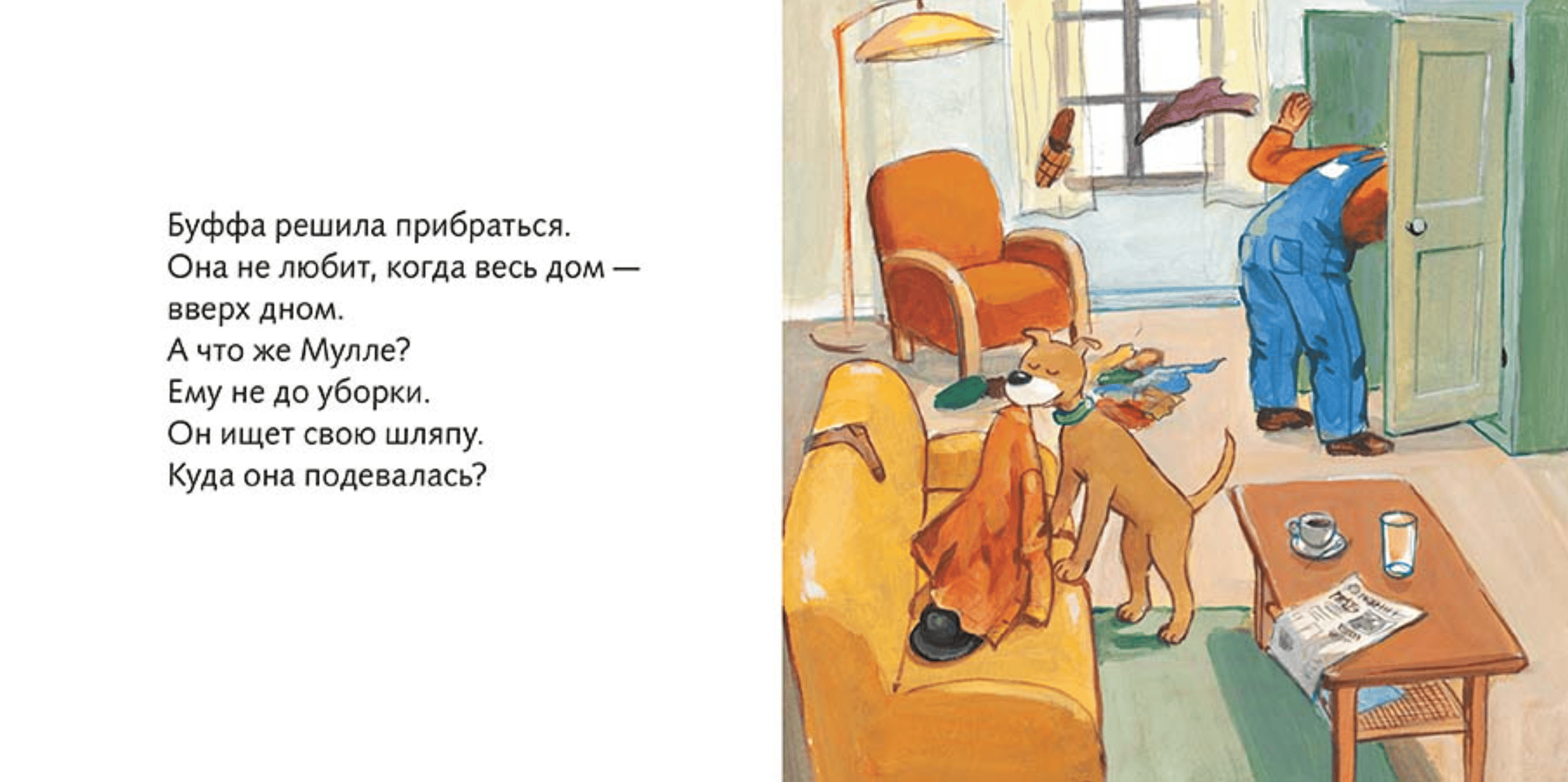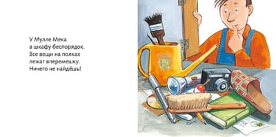 Mulle Mek's cozy house is a mess. Today, everything is jumbled: the clothes in the closet, the tools in the workshop, and the dishes in the kitchen. Mulle can't find anything—not even his hat. What to do? Luckily, his dog, Buffa, knows the answer: he needs to tidy up! And sure enough, as soon as Buffa tidies up, the hat is right there. However, it's not exactly where Mulle Mek expected.
