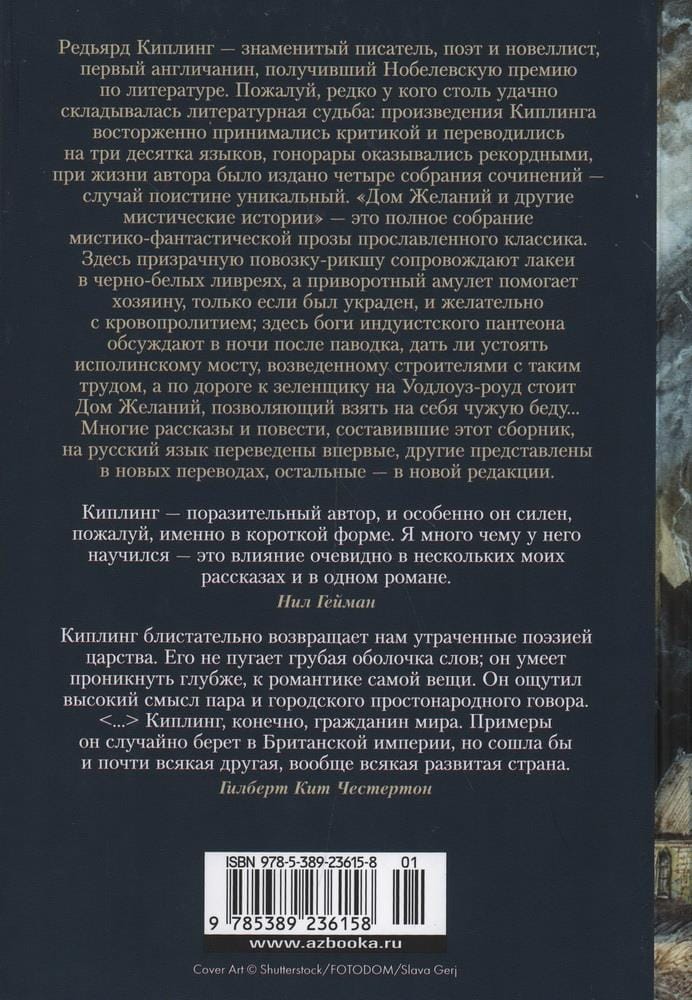 Rudyard Kipling is a famous writer, poet and short story writer, the first Englishman to win the Nobel Prize for Literature. Perhaps rarely has anyone so successful literary fate: Kipling's works were enthusiastically received by critics and translated into three dozen languages, royalties turned out to be record-breaking, during his lifetime the author was published four collections of works - a truly unique case. "The House of Desire and other mystical stories" - a complete collection of mystical-fantasy prose of the celebrated classic. Here a ghostly rickshaw cart is accompanied by footmen in black and white livery, and a charm amulet helps the owner only if it was stolen, and preferably with bloodshed; here the gods of the Hindu pantheon discuss in the night after the flood, whether to let stand a giant bridge, erected by builders with such difficulty, and on the way to the greengrocer on Wadlose-road is the House of Wishes, allowing you to take on someone else's misfortune ... Many of the stories and novellas that make up this collection have been translated into Russian for the first time, others are presented in new translations, and the rest are in new editions.