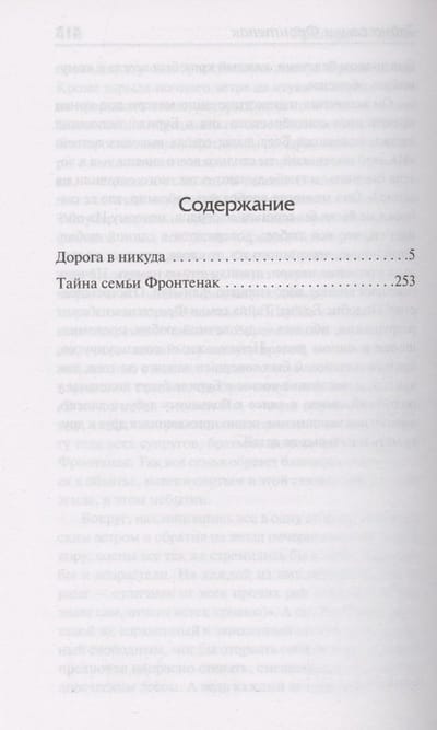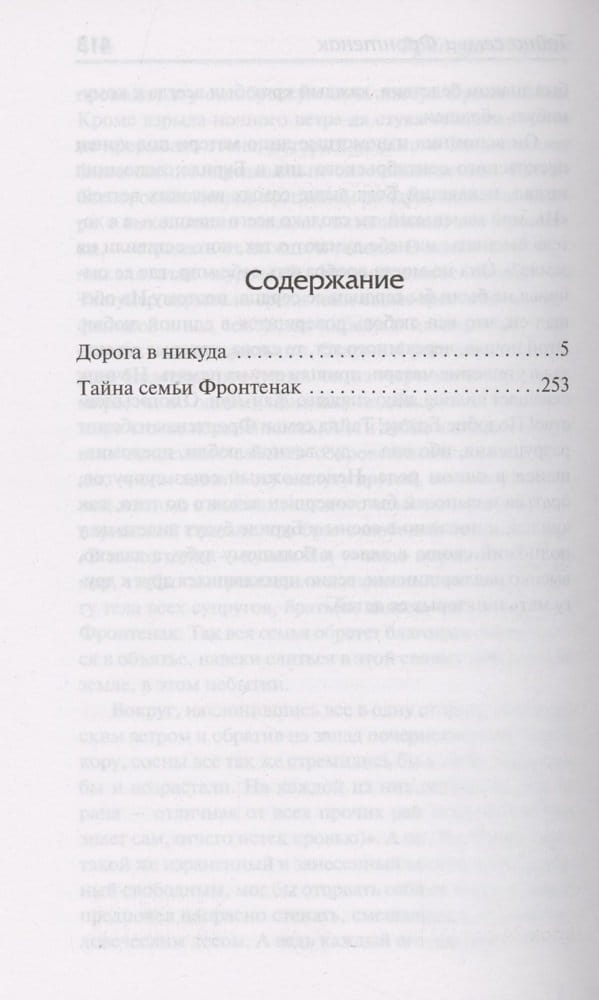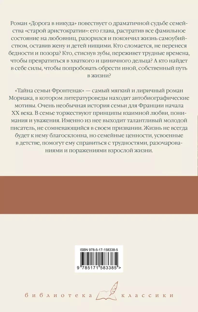 The novel "Road to Nowhere" tells of the dramatic fate of the family "old aristocracy", its head, wasting all the family fortune on mistresses, ruined and committed suicide, leaving his wife and children beggars. Who will break down, not enduring poverty and shame? Who, gritting his teeth, will survive the hard times to turn into a grasping and cynical businessman? And who will find the strength to try to find a different, their own way in life? "The mystery of the family Frontenac" - the softest and lyrical novel Moriac, in which literary scholars find autobiographical motifs. Very unusual family history for France in the early twentieth century. The principles of mutual love, understanding and respect triumph in the family. It is from it that a talented young writer emerges, who has no doubts about his vocation. Life will not always be favorable to him, but the family values learned in childhood will help him cope with the difficulties, disappointments and defeats of adult life.
