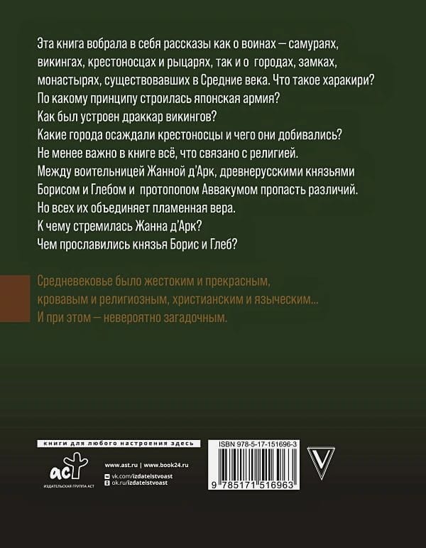 This book incorporates stories of both warriors - samurai, Vikings, crusaders, and knights - and the cities, castles, and monasteries that existed in the Middle Ages. What is harakiri? On what principle was the Japanese army built? How was the Viking drakkar organized? What cities did the Crusaders besiege and what did they accomplish?