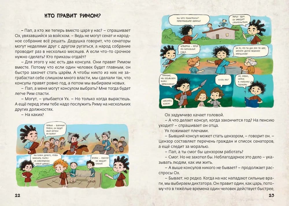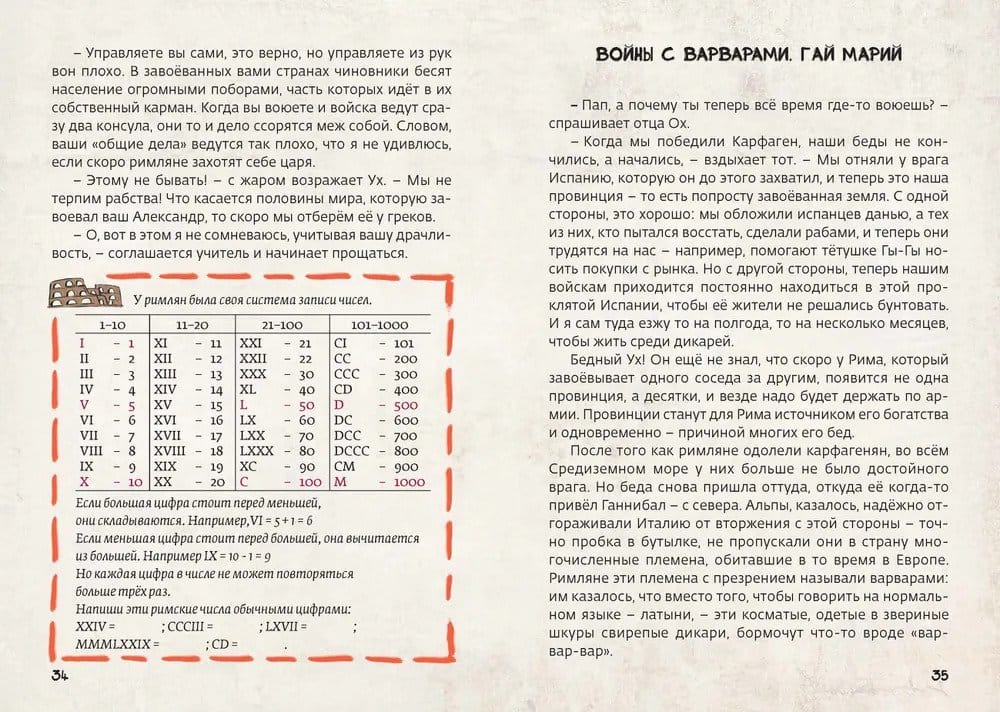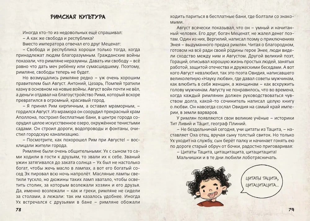 The entire history of ancient Rome from the founding of the city to the fall of the great empire unfolds on these pages by a series of amazing events, in the center of which is one ordinary family. The heroes of the book - a brave Roman Ugh, his family and friends - fight with barbarians, admire Caesar and scold Nero, watch gladiator fights in the Colosseum, escape the eruption of Vesuvius and experience many more incredible adventures. Ancient history comes alive in witty dialogues, comical situations and informative tasks and, while remaining authentic, becomes understandable and excitingly interesting.