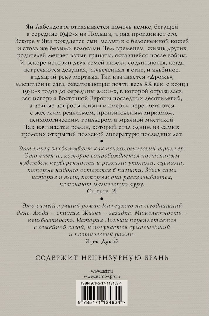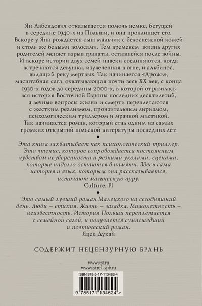 Jan Labendowicz refuses to help a German woman fleeing Poland in the mid-1940s, and she curses him. Soon a son is born to Jan: a boy with snow-white skin and equally white hair. Meanwhile, the other parents' lives are changed by the explosion of a grenade left over from the war. And soon the stories of two families are forever linked when a girl maimed in a fire and an albino who sees a river of the dead meet. Thus begins "Shiver", a sweeping saga spanning almost the entire 20th century, from the late 1930s to the mid-2000s, which reflects the entire history of Eastern Europe in recent decades, and the eternal questions of life and death are intertwined with hard realism, poignant lyricism, psychological thriller and dark mysticism. Thus begins a novel that has become one of the most resounding discoveries of Polish literature in recent years.