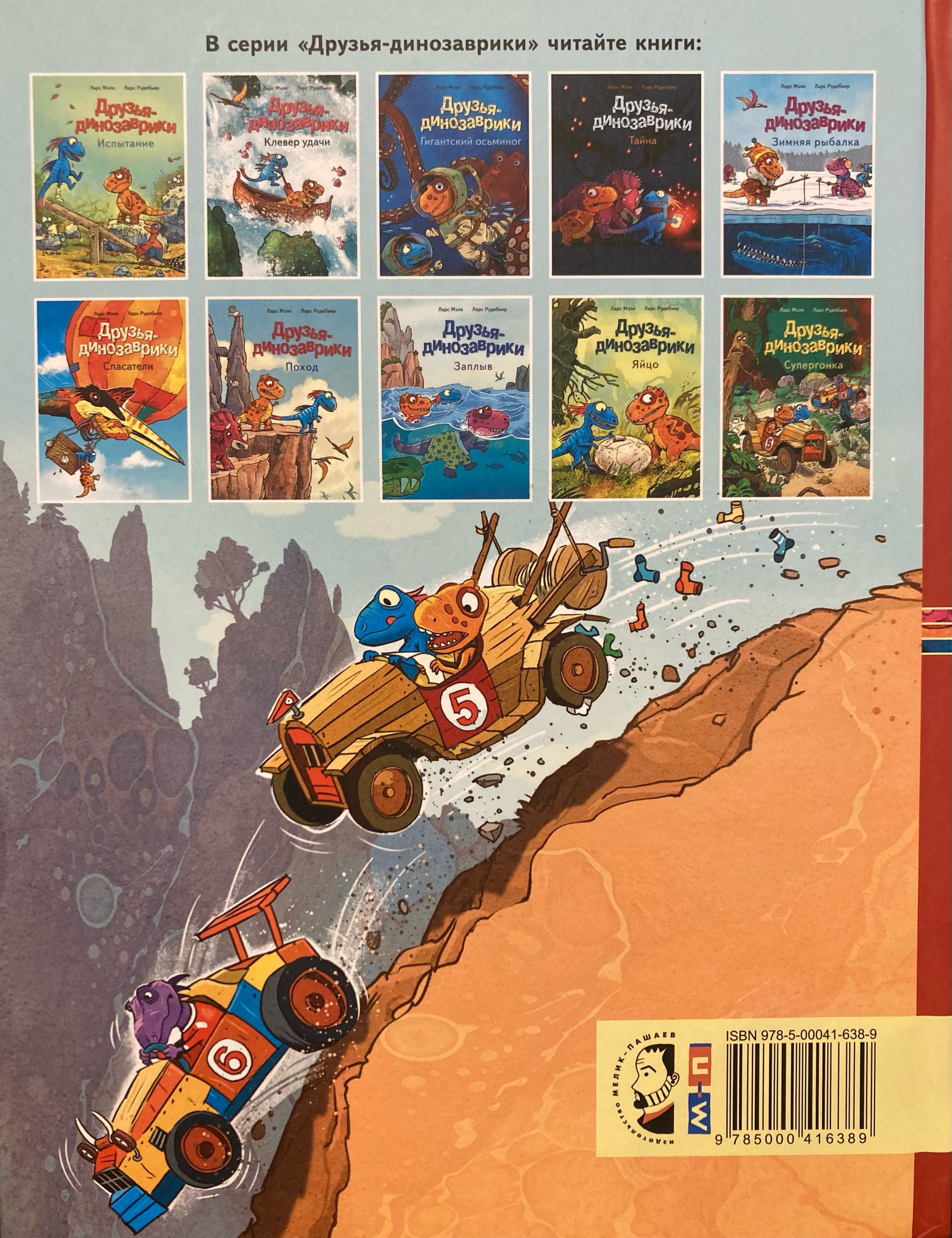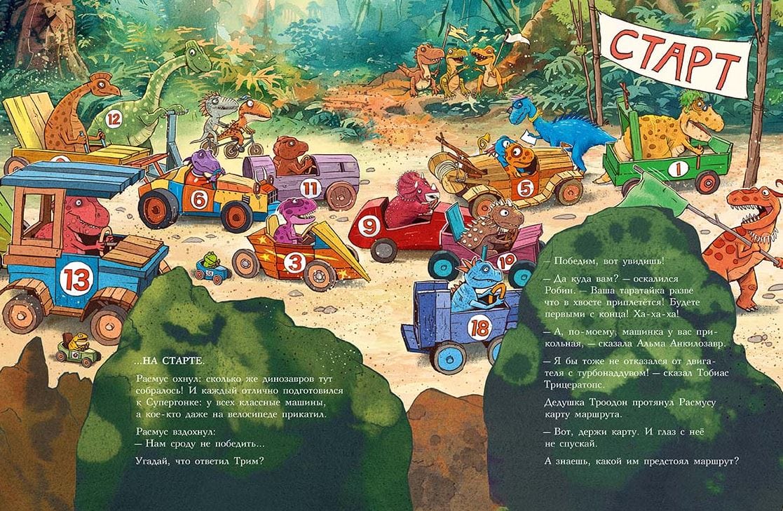 Each book in the Dinosaur Friends series tells the story of a day in the life of the tyrannosaurus Rasmus Rex and his best friend Trim Troodon. That day, the Swamp Forest Super Race started in Dinosauria. It was held in Dinosauria every year, but Rasmus and Trim had never participated in it before — they had nothing to drive. But this year, they got a car. Trim accidentally stumbled upon it in his grandfather’s secret room of mechanisms and inventions and persuaded his grandfather to prepare the car for the Super Race. Grandpa Troodon came up with a bunch of useful devices, and the old car was transformed — it became fast, maneuverable, and safe. For the first time in their lives, driver Trim and navigator Rasmus had to go through a very difficult track. Despite this, Trim was sure that they would win. Rasmus, on the contrary, strongly doubted that they would be able to overcome all the obstacles and beat Freddy Fukuiraptor, the super racer who had been the winner for the past five years. The friends didn't win the race, but they did expose the cheater and would-be champion Freddy Fukuiraptor.