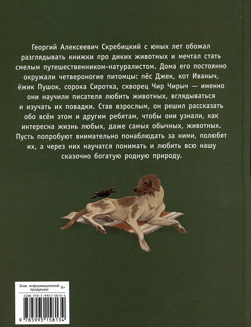 Georgy Alekseevich Skrebitsky from a young age loved to look at books about wild animals and dreamed of becoming a brave traveler-naturalist. At home he was constantly surrounded by four-legged pets: dog Jack, cat Ivanych, hedgehog Pushok, magpie Sirotka, starling Chir Chirych - it was they who taught the writer to love animals, to look and study their habits. Becoming an adult, he decided to tell about all this and other children to learn how interesting the life of any, even the most ordinary, animals. Let them try to observe them carefully, love them, and through them learn to understand and love all our fabulously rich native nature.