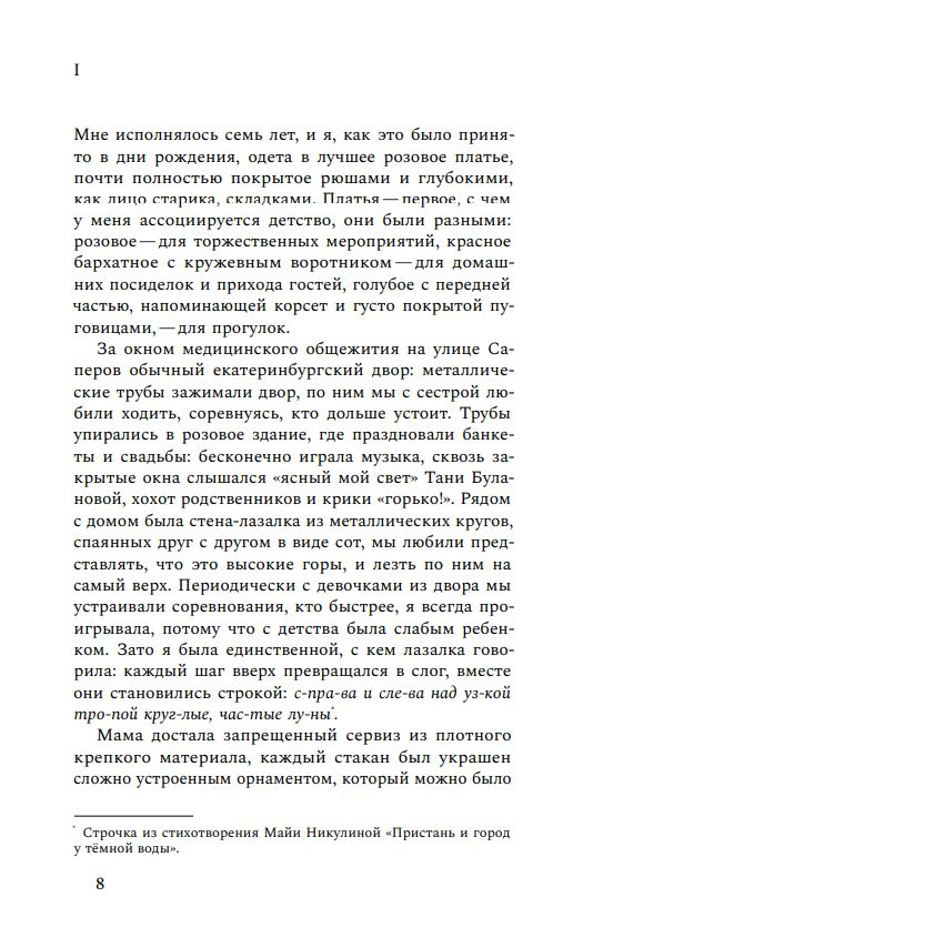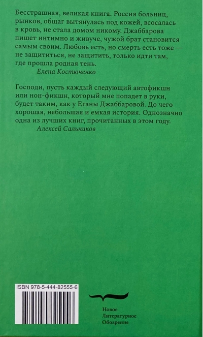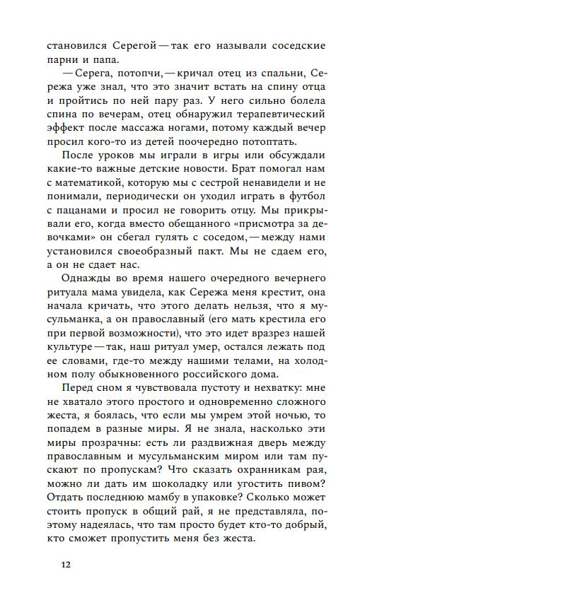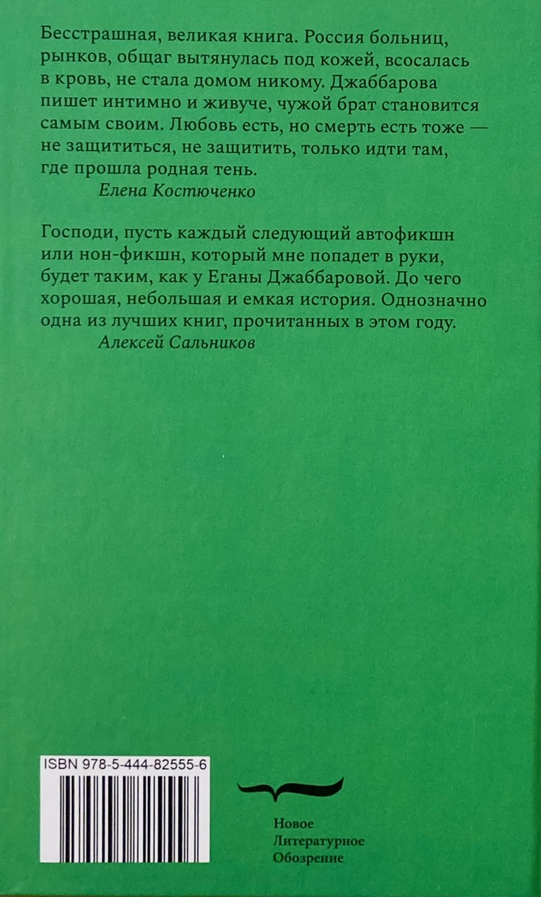 This text is similar to the Russian road: it is uneven, with bumps and pits, with repairs in the middle of the track. I don’t have a navigator for Seryoga’s life, so all I have to do is feel it. In the book, Egan Jabbarova attempts to reconstruct a short biography of Sergei’s half-brother, who was born from an extramarital affair of her father. Following his brother on the route that led him to an early and tragic death, the author discovers that the history of the country of the late 1990s and early 2000s: interethnic tension, poverty, struggle for survival, an epidemic of addictions and an identity crisis. At the same time, addressing the fate of the deceased brother becomes an act of love and memory, the only way to connect the discrete events of his and his life and bridge the gap - cultural, religious, being.