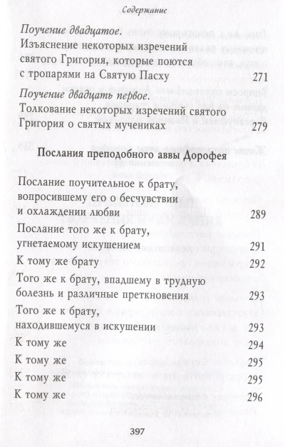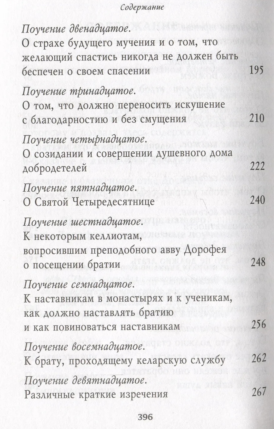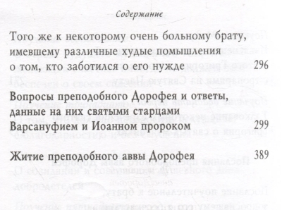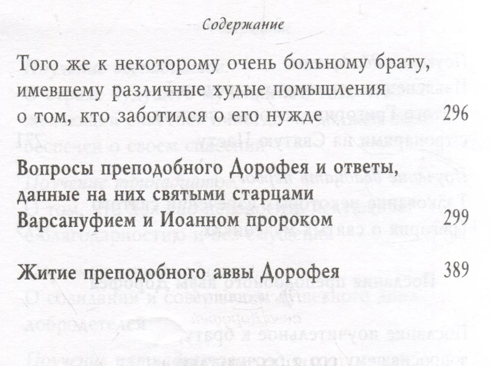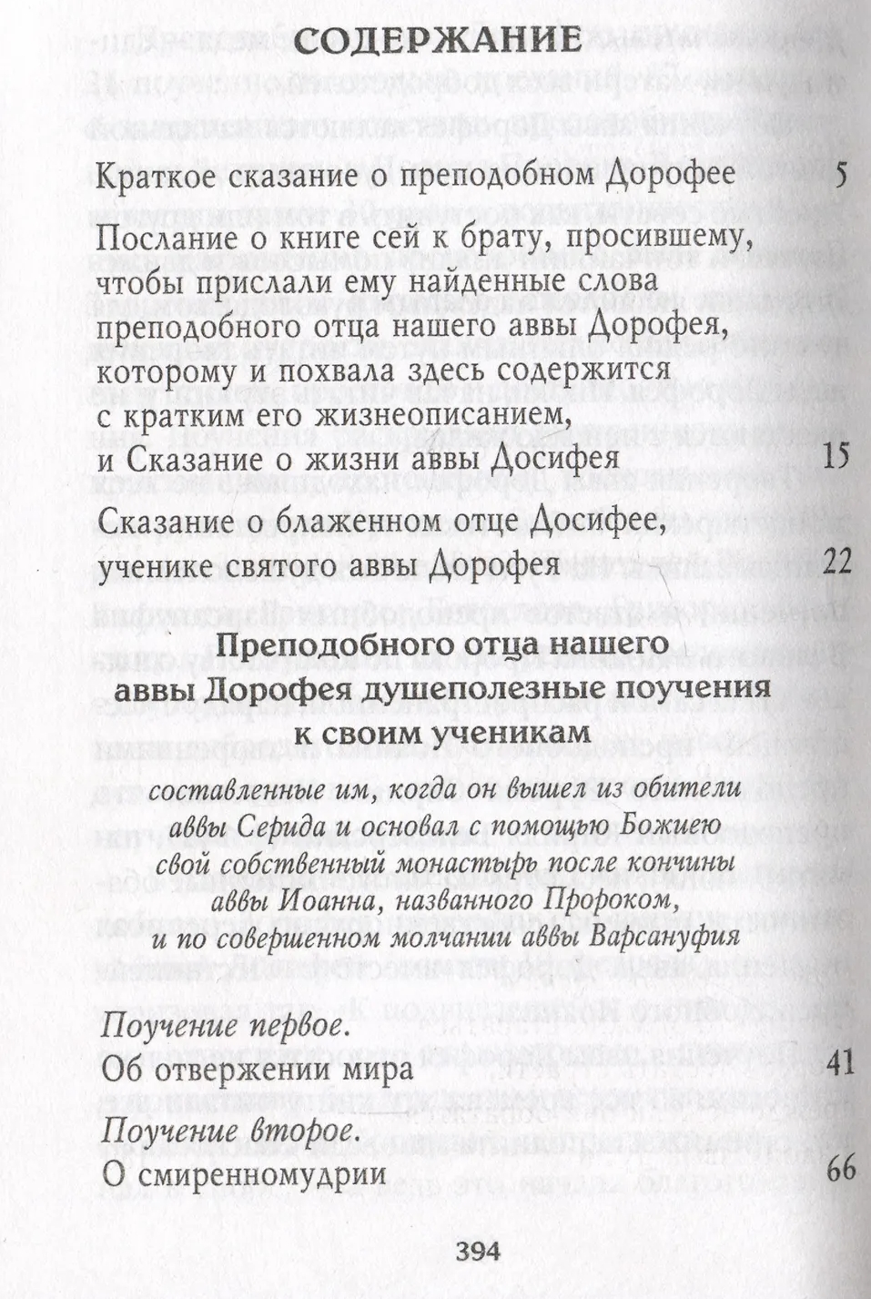 The book includes the soul-beneficial teachings of the Venerable Abba Dorotheus, his letters, questions of Abba Dorotheus and the answers given to them by the holy elders Barsanuphius and John the Prophet, as well as the life of the Venerable Abba.