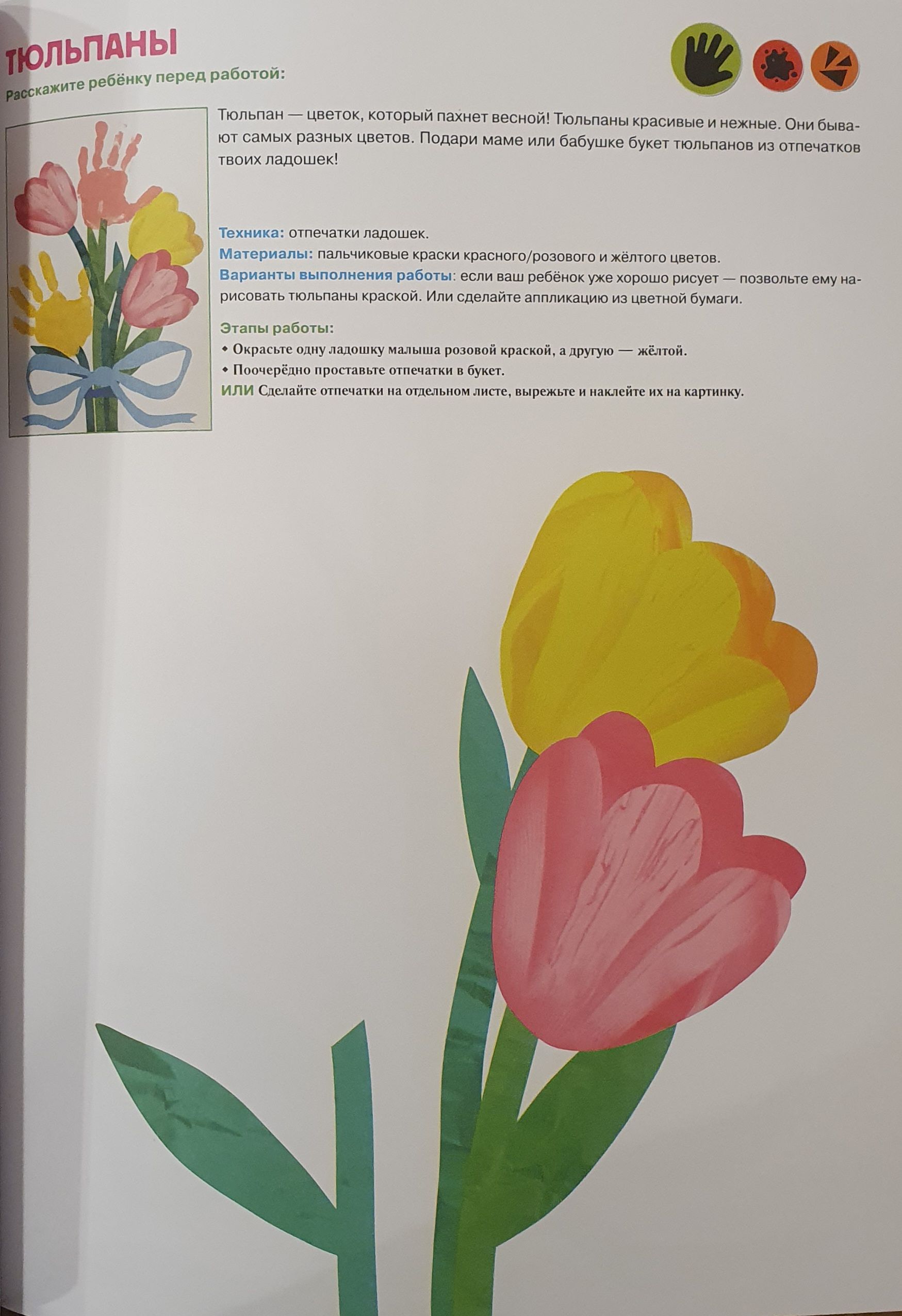 The manual contains all the creative techniques for toddlers: simple appliqué, drawing with palms, feet, plasticine, fingers, brush and wax crayons.