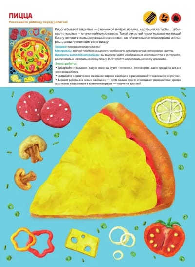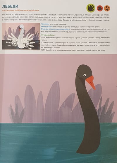 There are 60 art-sheets and 40 ready-made activities in the album. Each activity has a sheet for mom with instructions, a picture for practicing, tips for pre-talk with your baby, description of materials and techniques. And a sheet for the baby with a large picture to create.